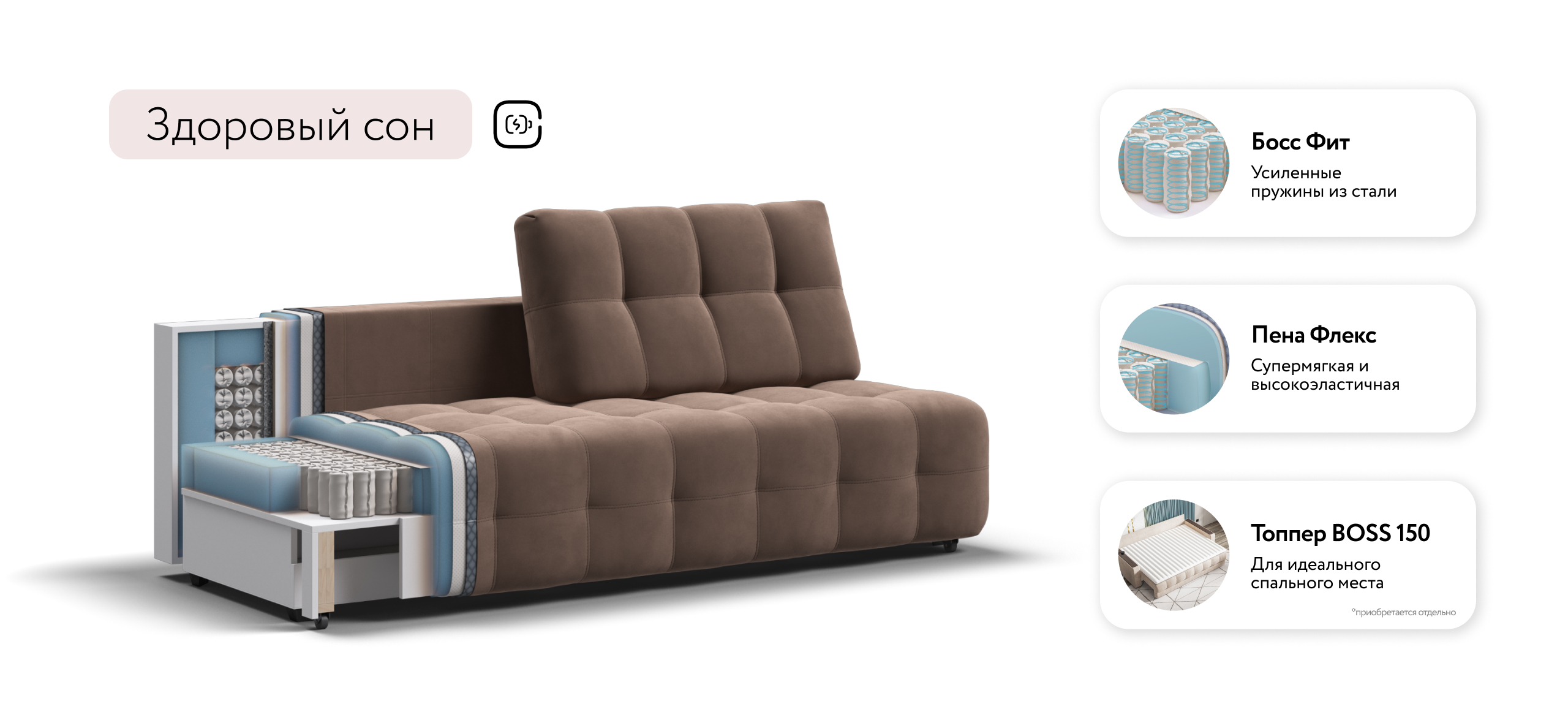 Диван BOSS MINI - отсутствие подлокотников и минималистичный дизайн. Надежный механизм трансформации благодаря стальным направляющим BOSS TITAN. 2 режима раскладки: RELAX позволяет увеличить глубину сиденья на 30% для большего комфорта, а полная раскладка обеспечивает большое и ровное спальное место. Ощутите истинный комфорт у себя дома!