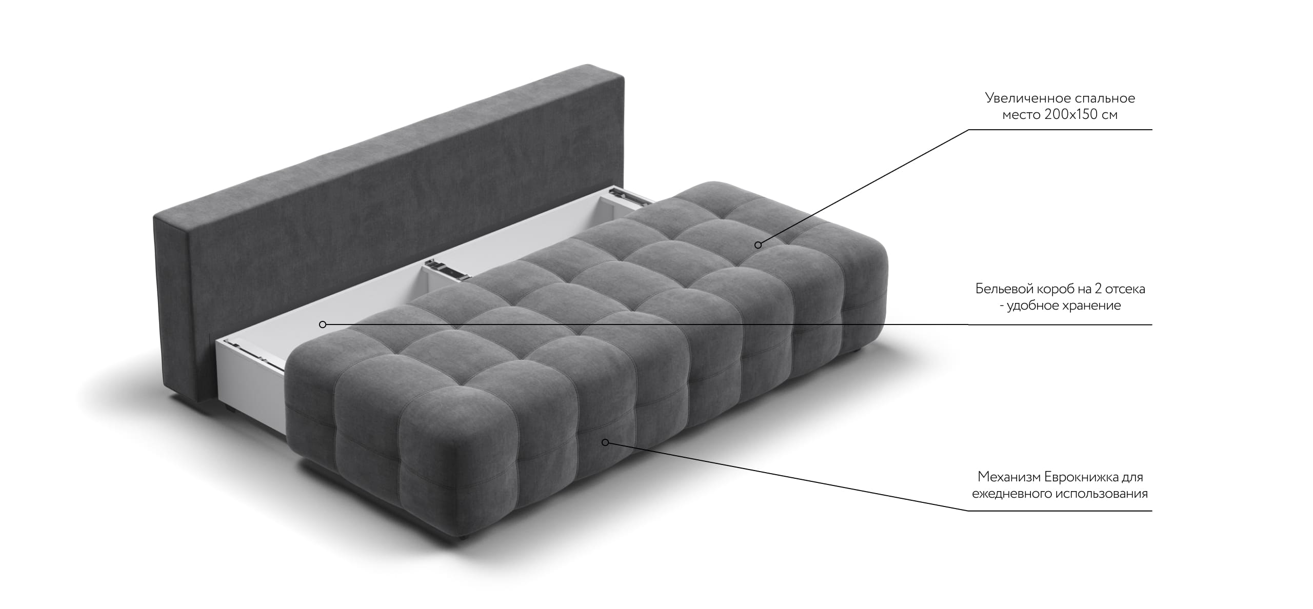Диван BOSS MINI - отсутствие подлокотников и минималистичный дизайн. Надежный механизм трансформации благодаря стальным направляющим BOSS TITAN. 2 режима раскладки: RELAX позволяет увеличить глубину сиденья на 30% для большего комфорта, а полная раскладка обеспечивает большое и ровное спальное место. Ощутите истинный комфорт у себя дома!