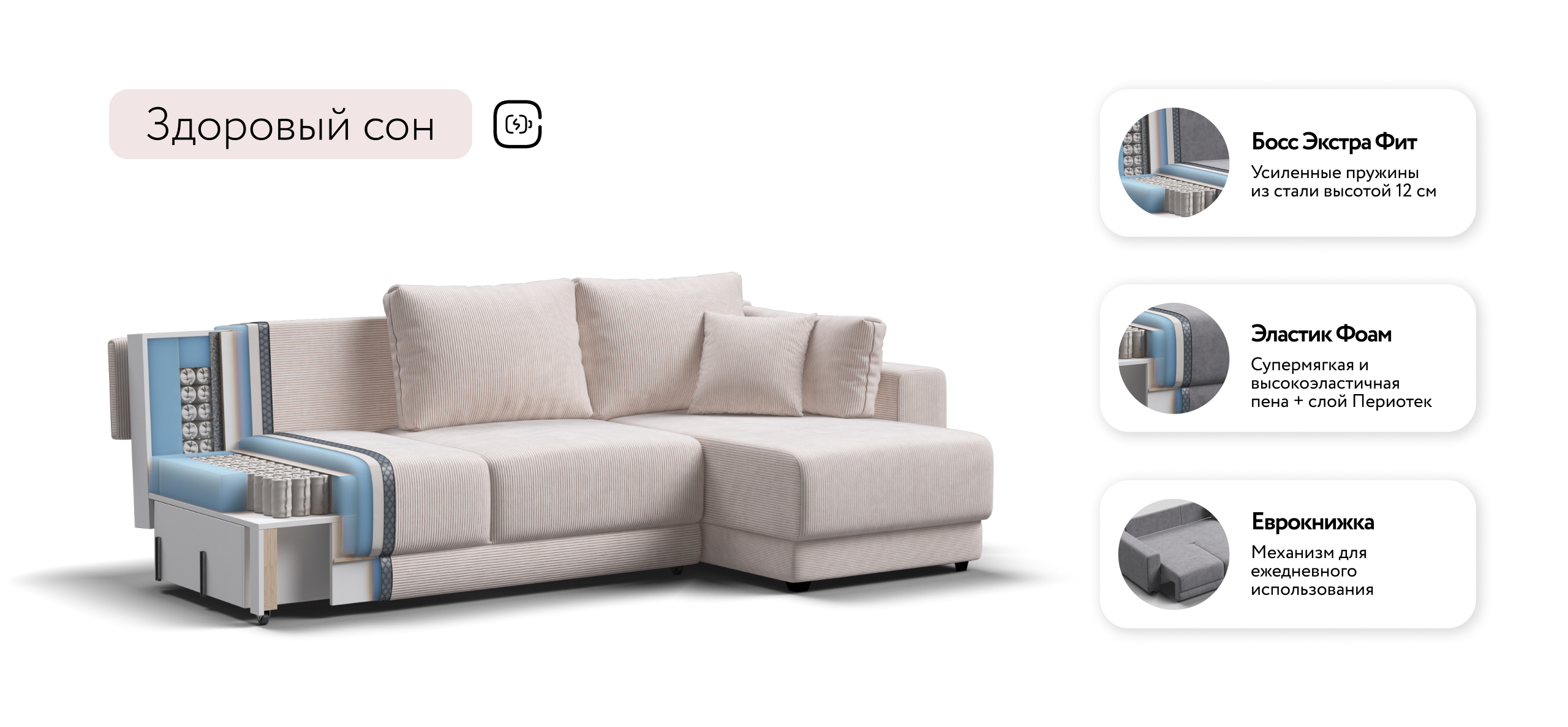 Оснащённый независимым пружинным блоком и высокоэластичной пеной Эластик Фоам с дополнительным слоем периотека, диван гарантирует анатомическую поддержку и комфортный сон. Простой и надёжный механизм трансформации «еврокнижка» позволяет легко преобразовать диван в просторное спальное место. Универсальный угол позволит Вам переставить оттоманку и поменять положение угла при необходимости.