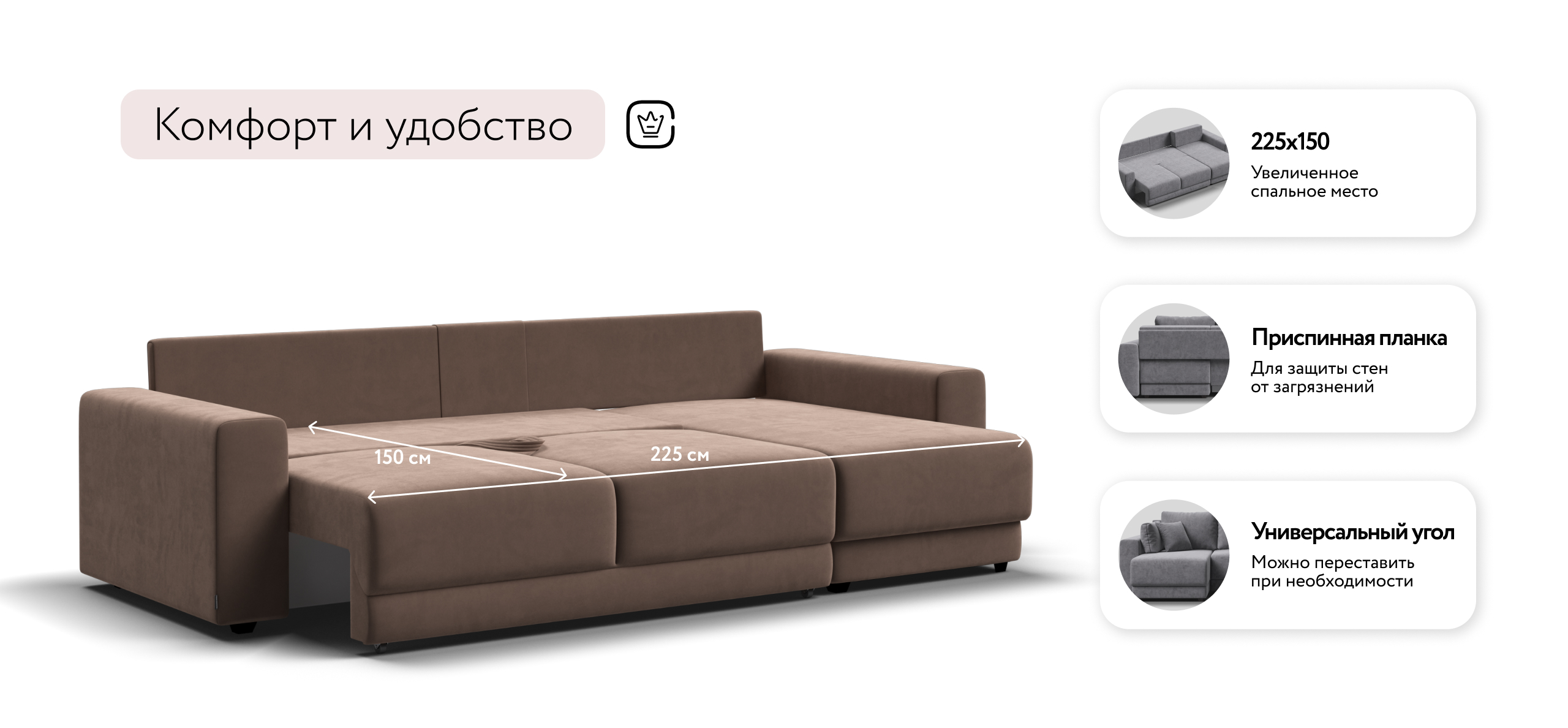 Оснащённый независимым пружинным блоком и высокоэластичной пеной Эластик Фоам с дополнительным слоем периотека, диван гарантирует анатомическую поддержку и комфортный сон. Простой и надёжный механизм трансформации «еврокнижка» позволяет легко преобразовать диван в просторное спальное место. Универсальный угол позволит Вам переставить оттоманку и поменять положение угла при необходимости.