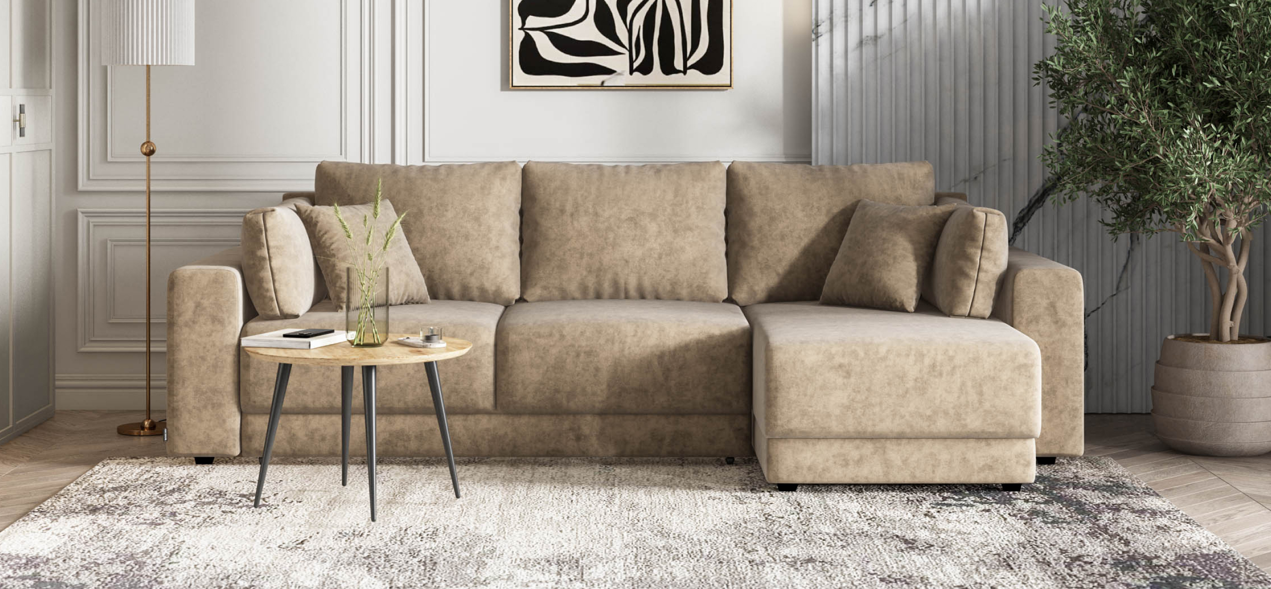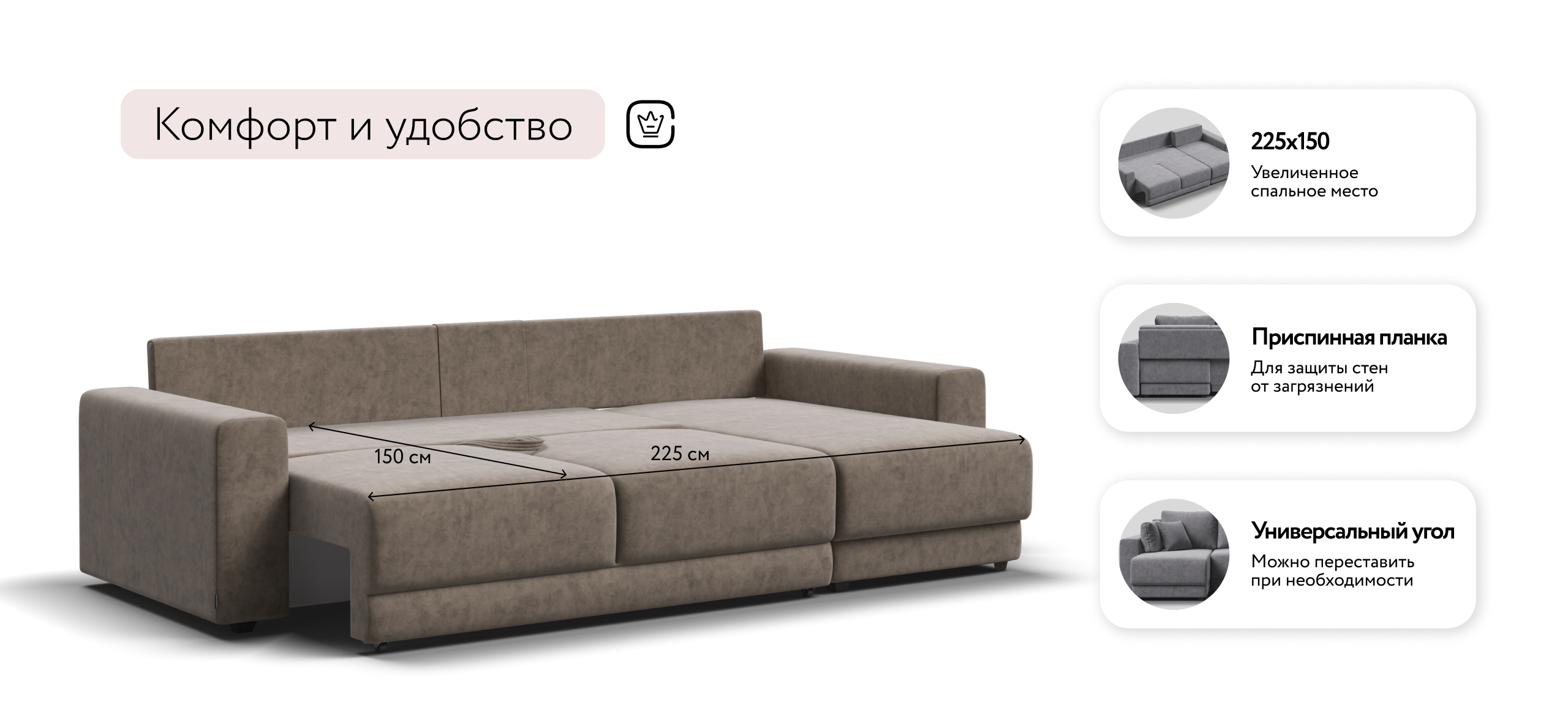 Оснащённый независимым пружинным блоком и высокоэластичной пеной Эластик Фоам с дополнительным слоем периотека, диван гарантирует анатомическую поддержку и комфортный сон. Простой и надёжный механизм трансформации «еврокнижка» позволяет легко преобразовать диван в просторное спальное место. Универсальный угол позволит Вам переставить оттоманку и поменять положение угла при необходимости.