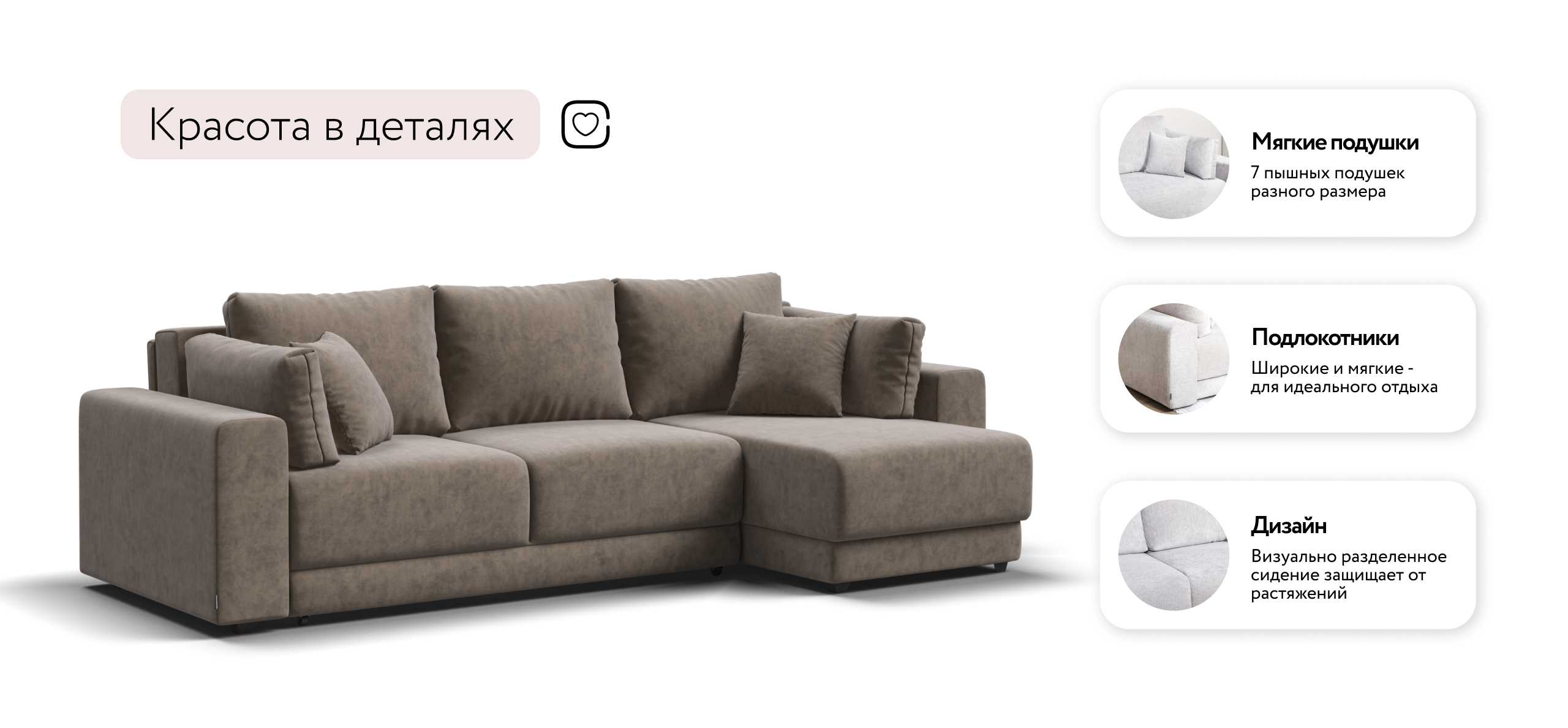 Угловой диван Босс Прайм ХЛ - это сочетание современного дизайна и продуманной эргономики, создающее уютную атмосферу в любом интерьере. Визуально разделённое сиденье, широкие мягкие подлокотники и пышные подушки разного размера обеспечивают не только эстетическую привлекательность, но и максимальный комфорт.