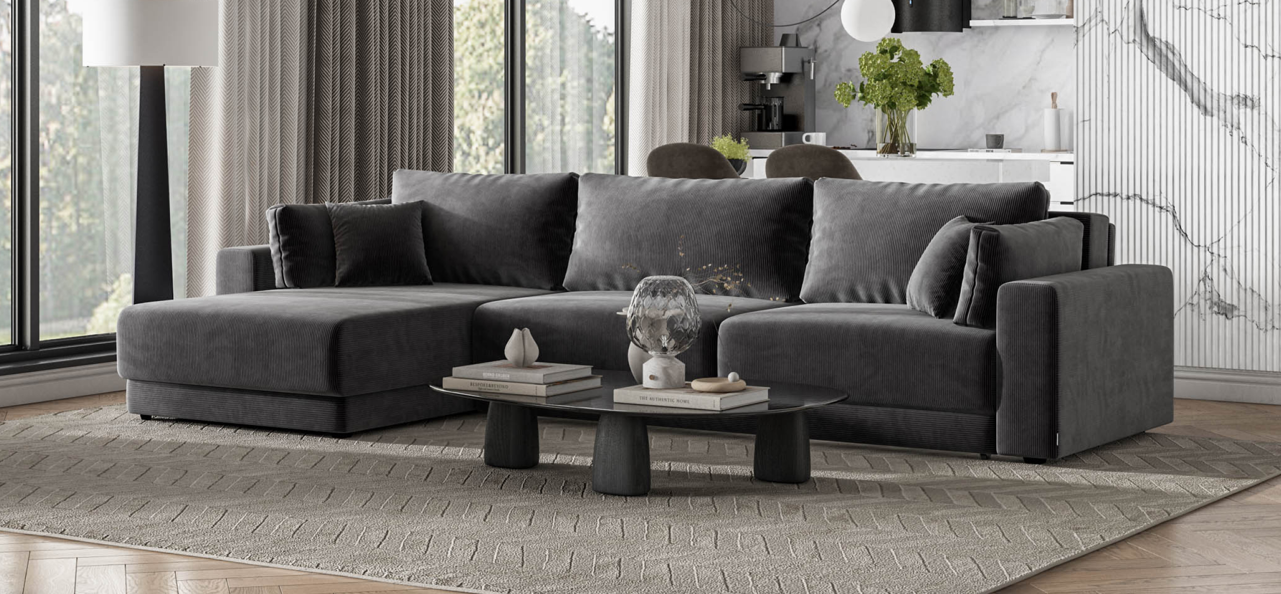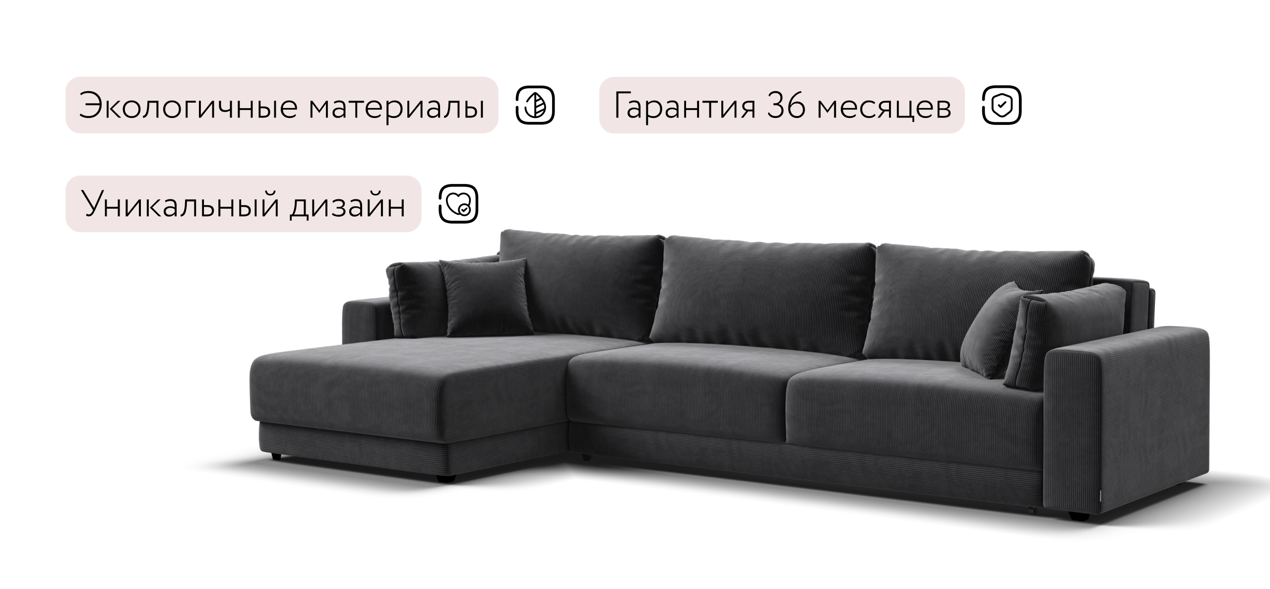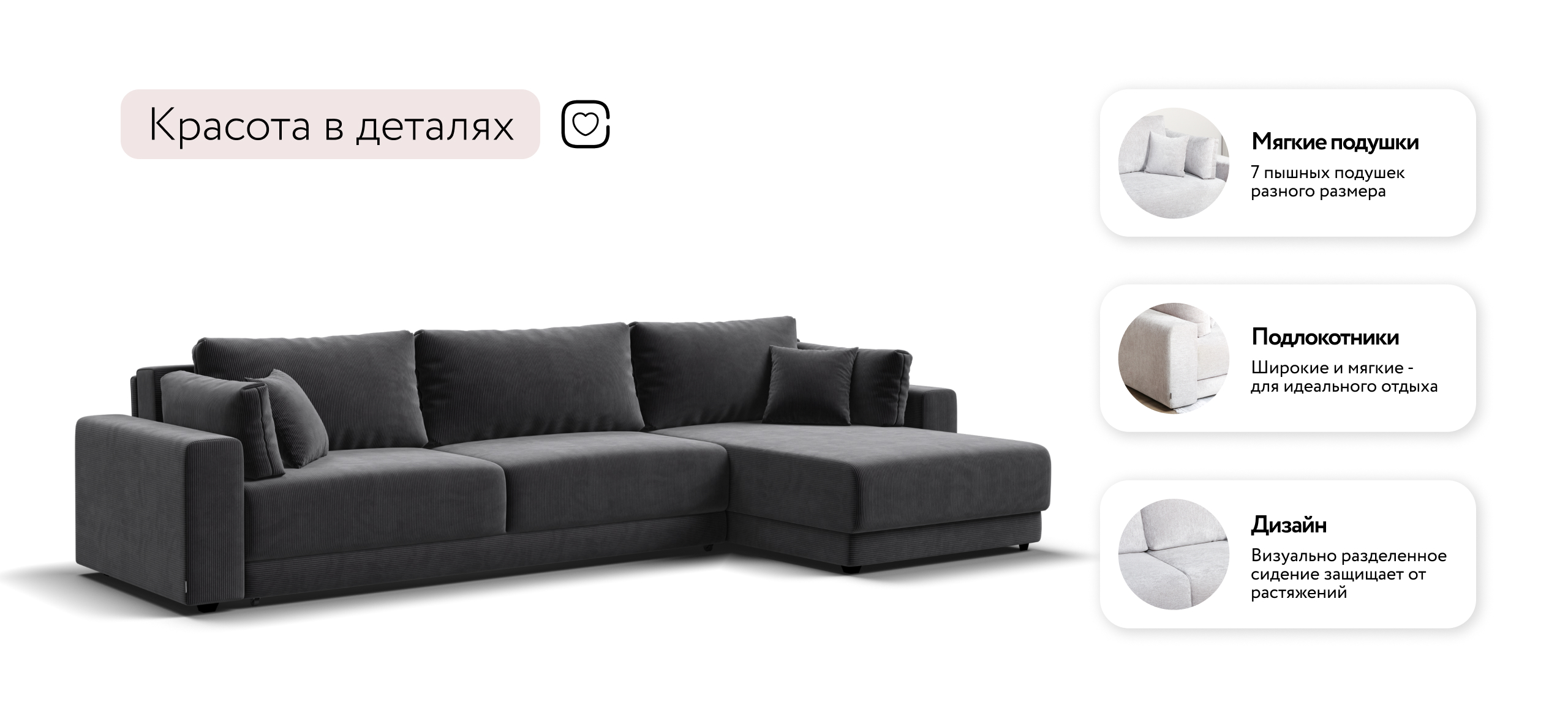 Угловой диван Босс Прайм Макс - это сочетание современного дизайна и продуманной эргономики, создающее уютную атмосферу в любом интерьере. Визуально разделённое сиденье, широкие мягкие подлокотники и пышные подушки разного размера обеспечивают не только эстетическую привлекательность, но и максимальный комфорт.