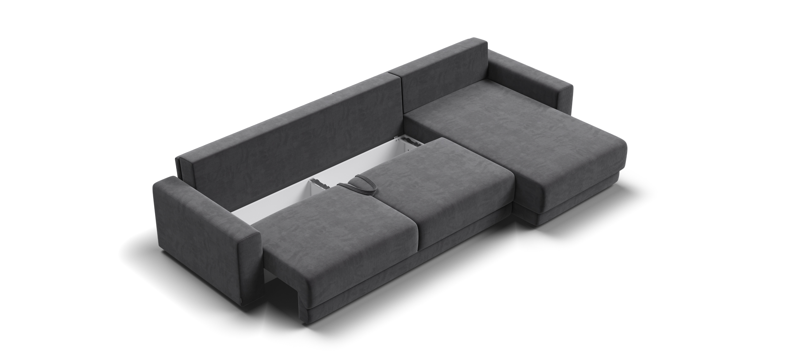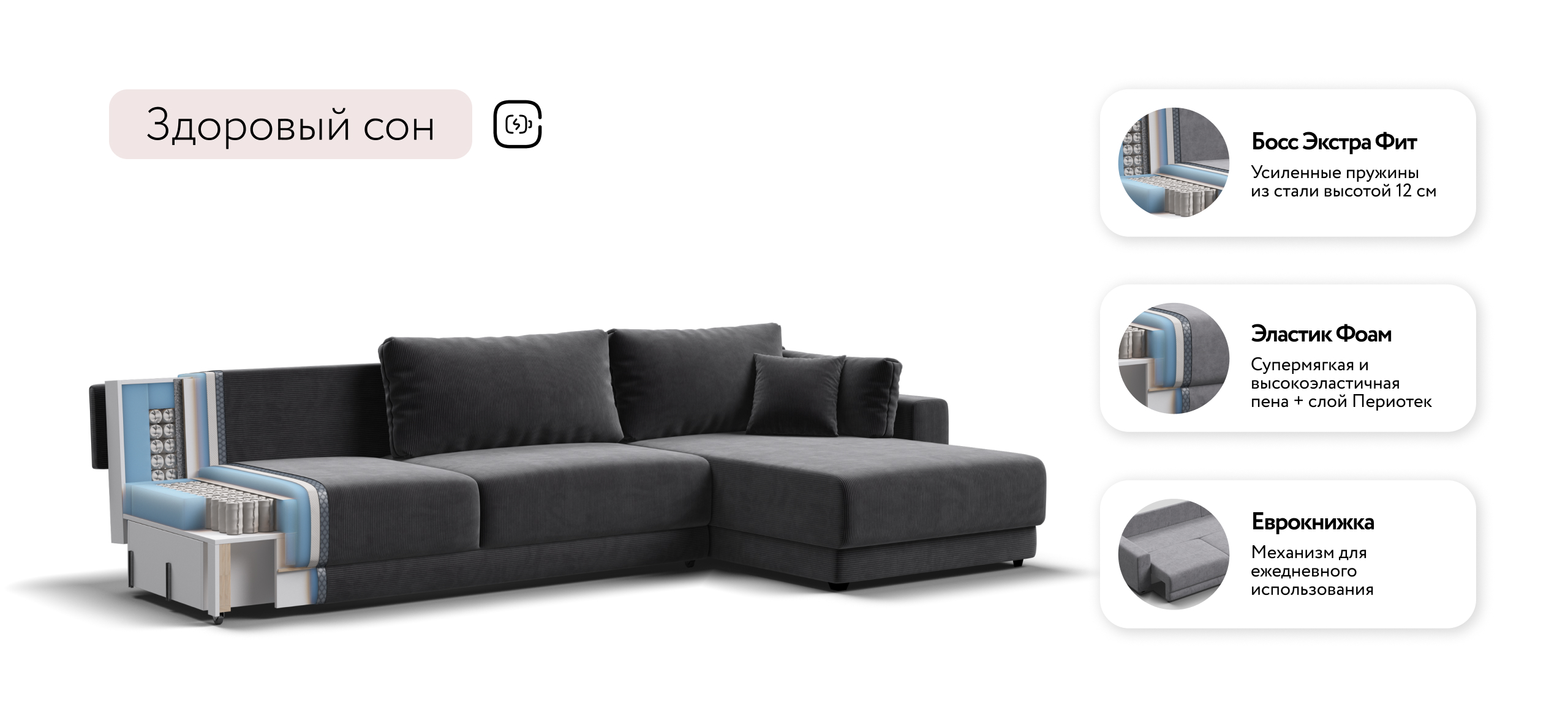 Оснащённый независимым пружинным блоком и высокоэластичной пеной Эластик Фоам с дополнительным слоем периотека, диван гарантирует анатомическую поддержку и комфортный сон. Простой и надёжный механизм трансформации «еврокнижка» позволяет легко преобразовать диван в просторное спальное место. Универсальный угол позволит Вам переставить оттоманку и поменять положение угла при необходимости.