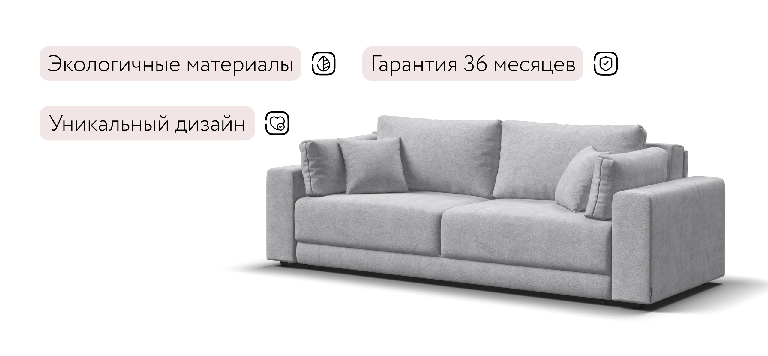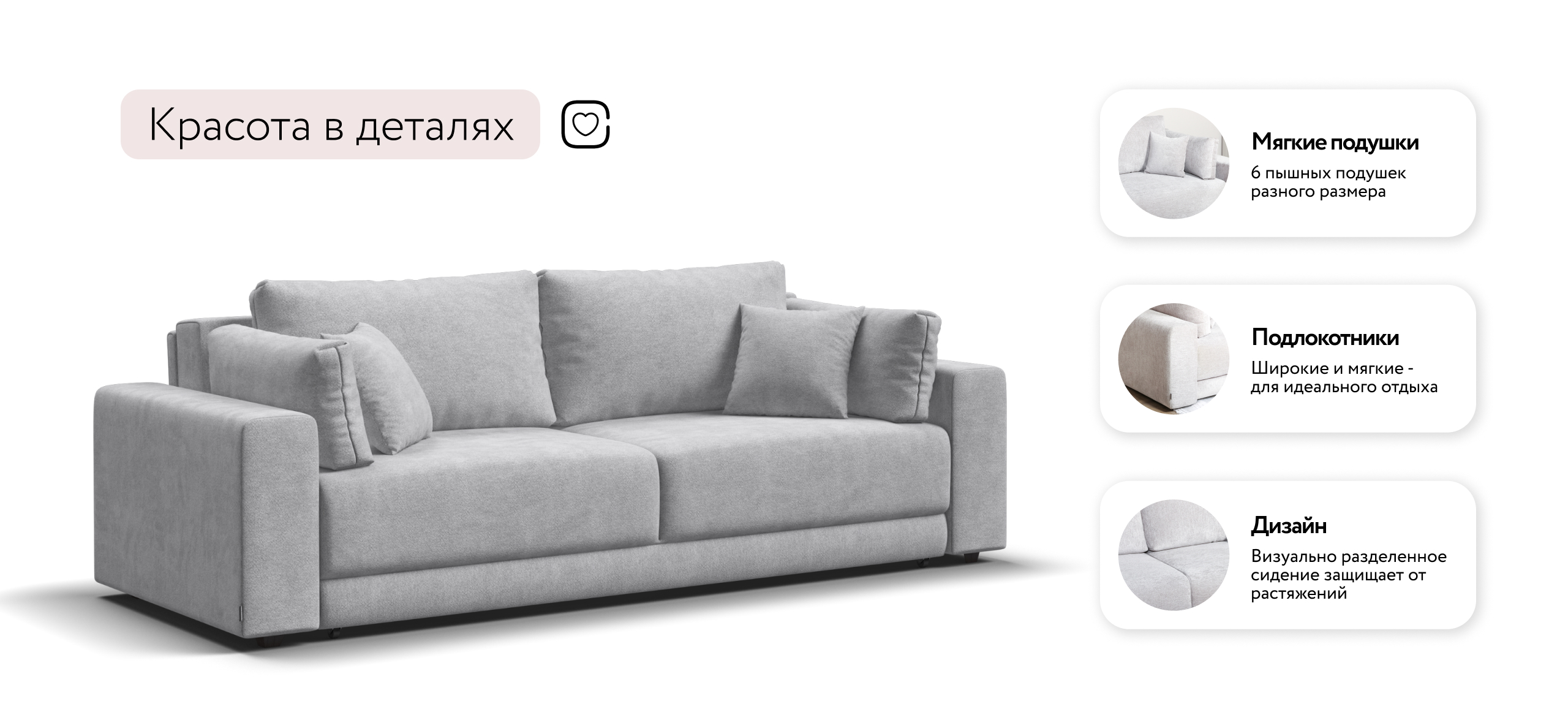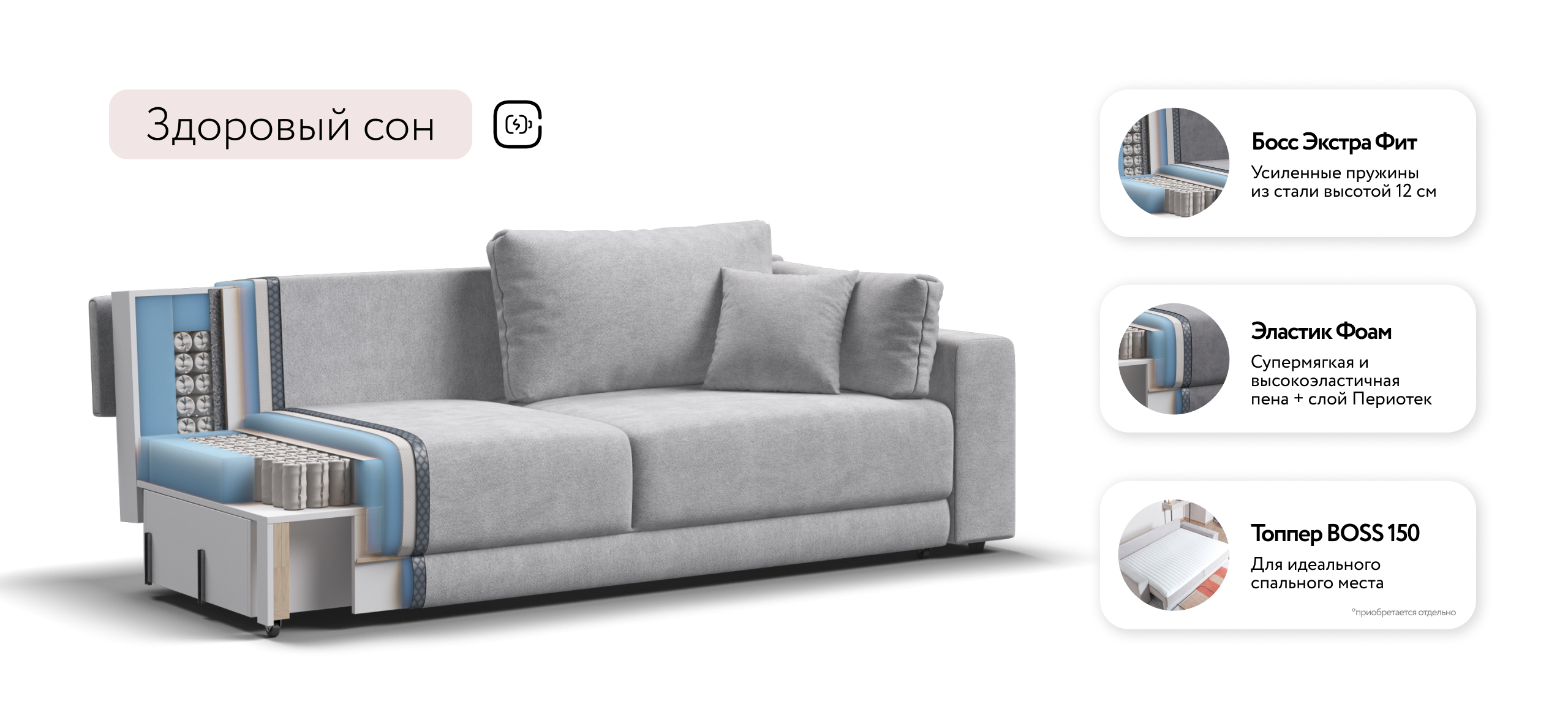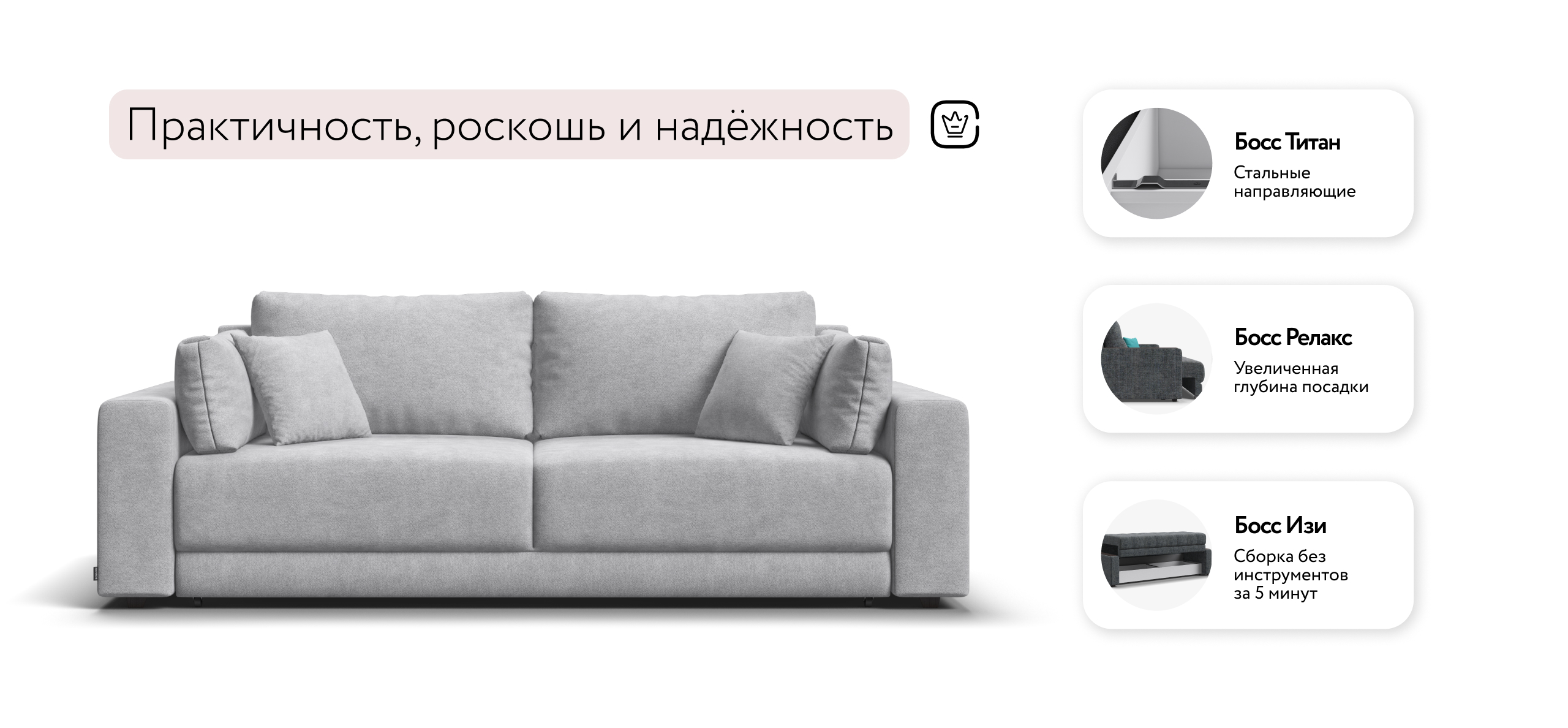 Босс Прайм — это сочетание современного дизайна и продуманной эргономики, создающее уютную атмосферу в любом интерьере. Визуально разделённое сиденье, широкие мягкие подлокотники и пышные подушки разного размера обеспечивают не только эстетическую привлекательность, но и максимальный комфорт.​