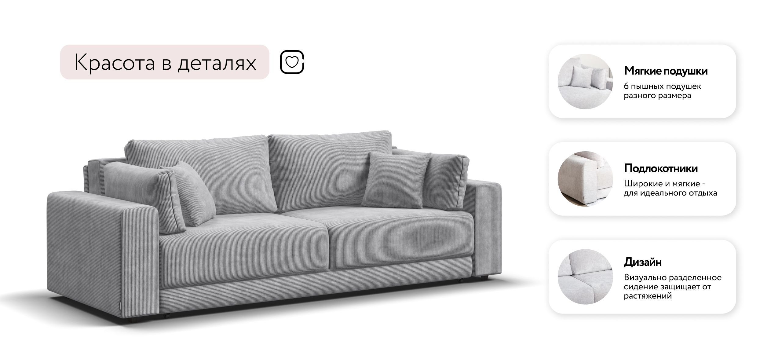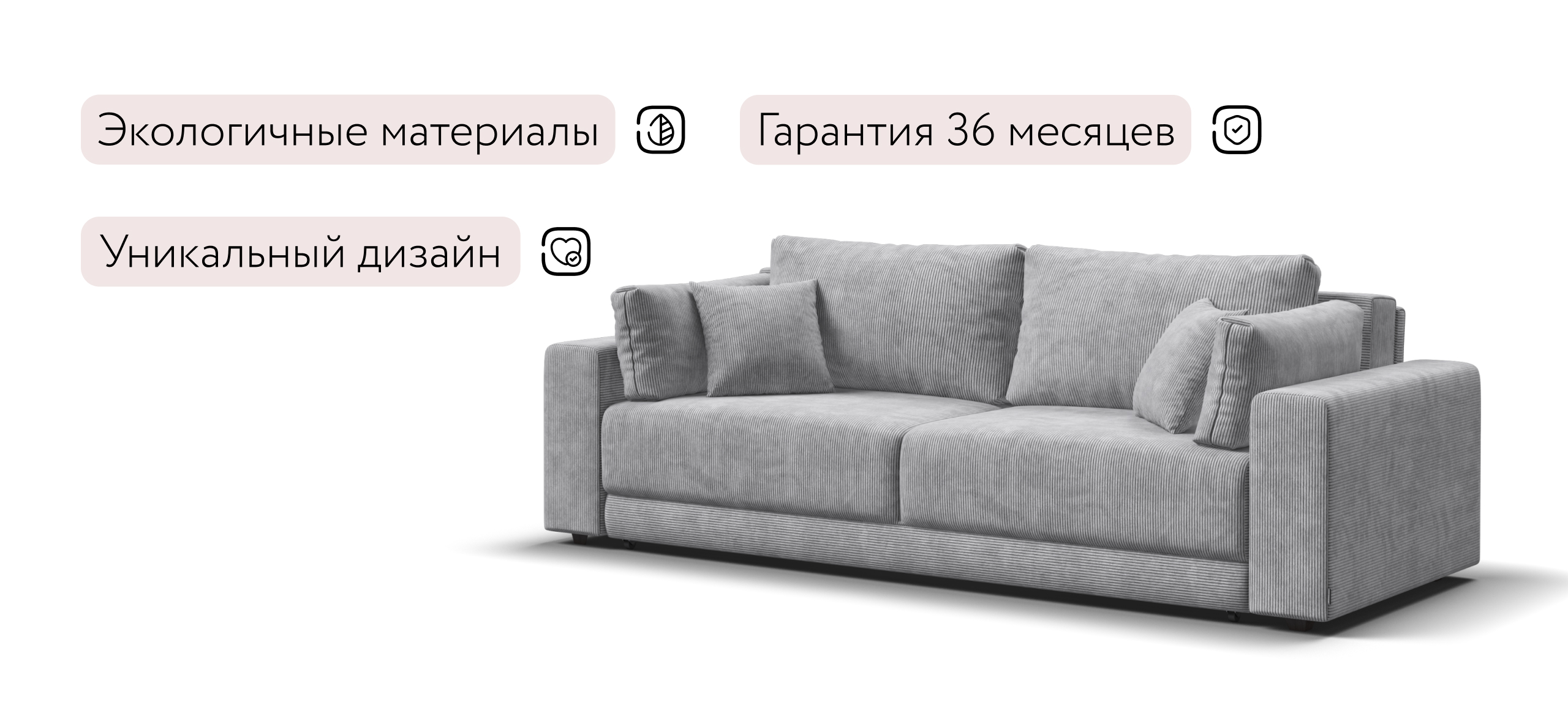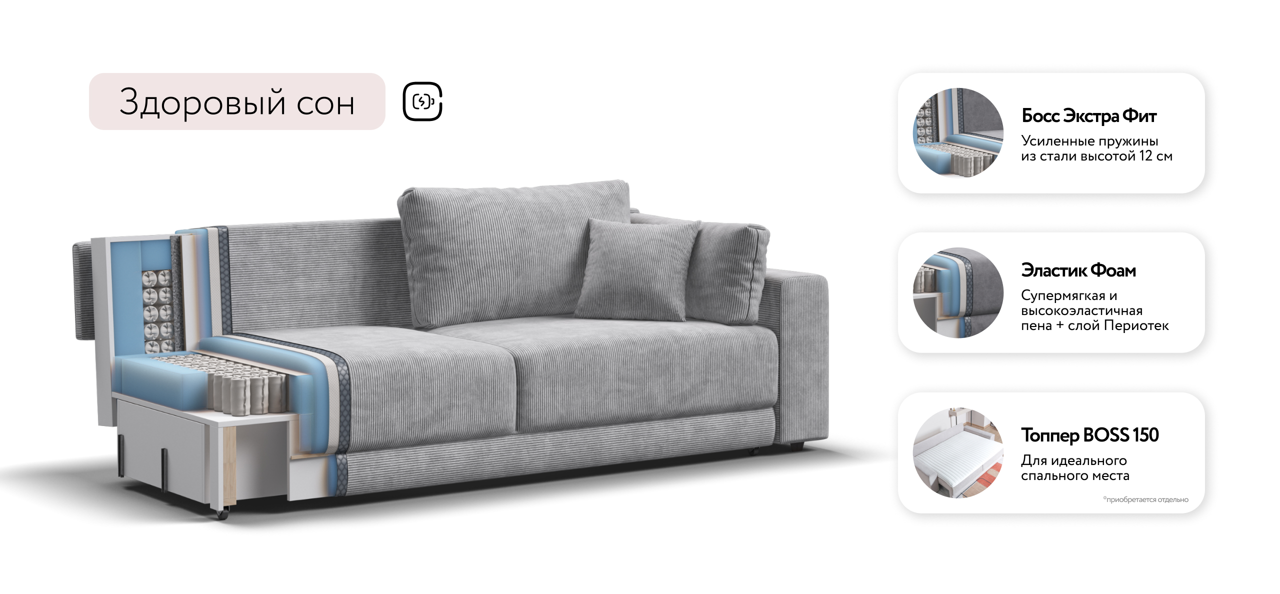 Босс Прайм — это сочетание современного дизайна и продуманной эргономики, создающее уютную атмосферу в любом интерьере. Визуально разделённое сиденье, широкие мягкие подлокотники и пышные подушки разного размера обеспечивают не только эстетическую привлекательность, но и максимальный комфорт.