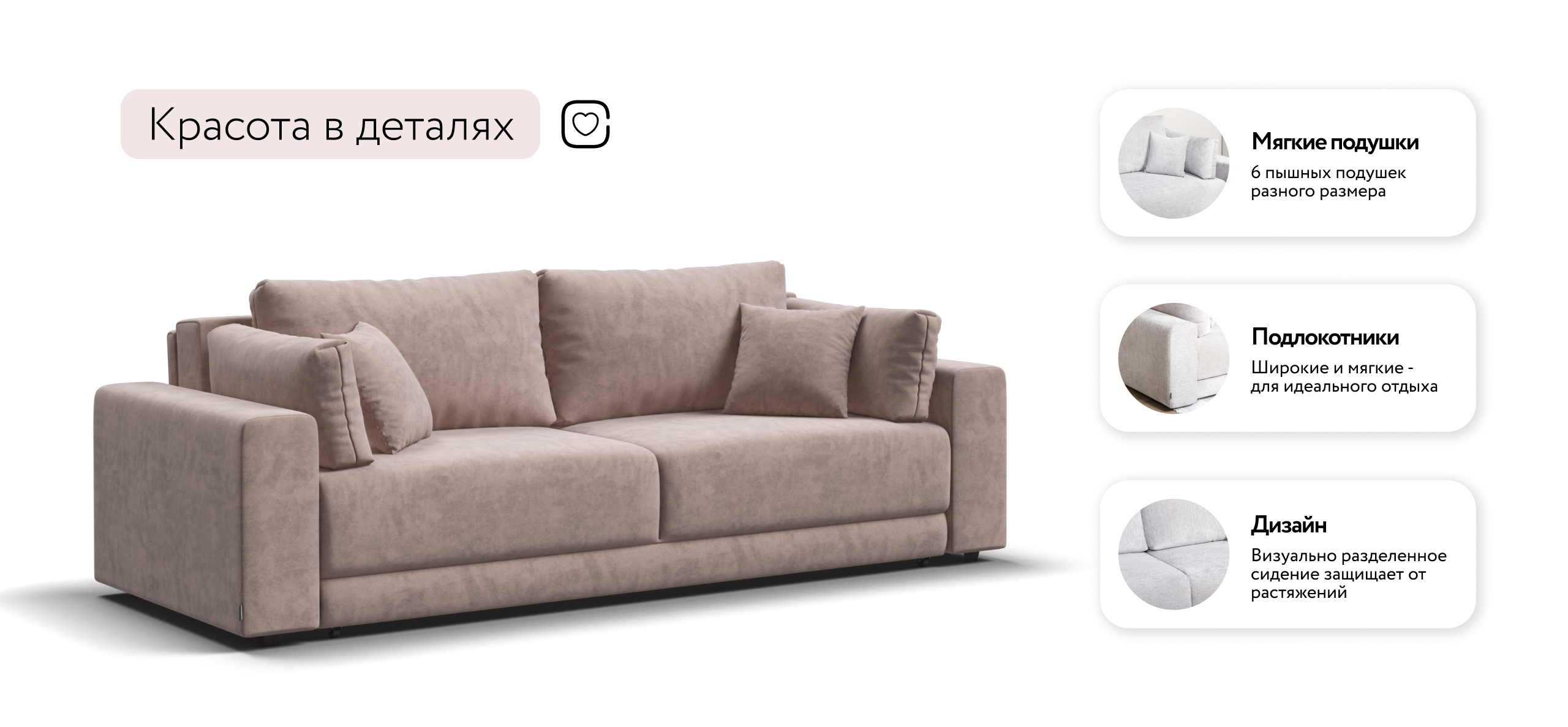 Босс Прайм — это сочетание современного дизайна и продуманной эргономики, создающее уютную атмосферу в любом интерьере. Визуально разделённое сиденье, широкие мягкие подлокотники и пышные подушки разного размера обеспечивают не только эстетическую привлекательность, но и максимальный комфорт.​