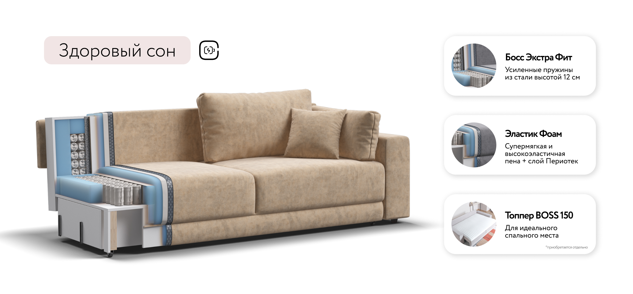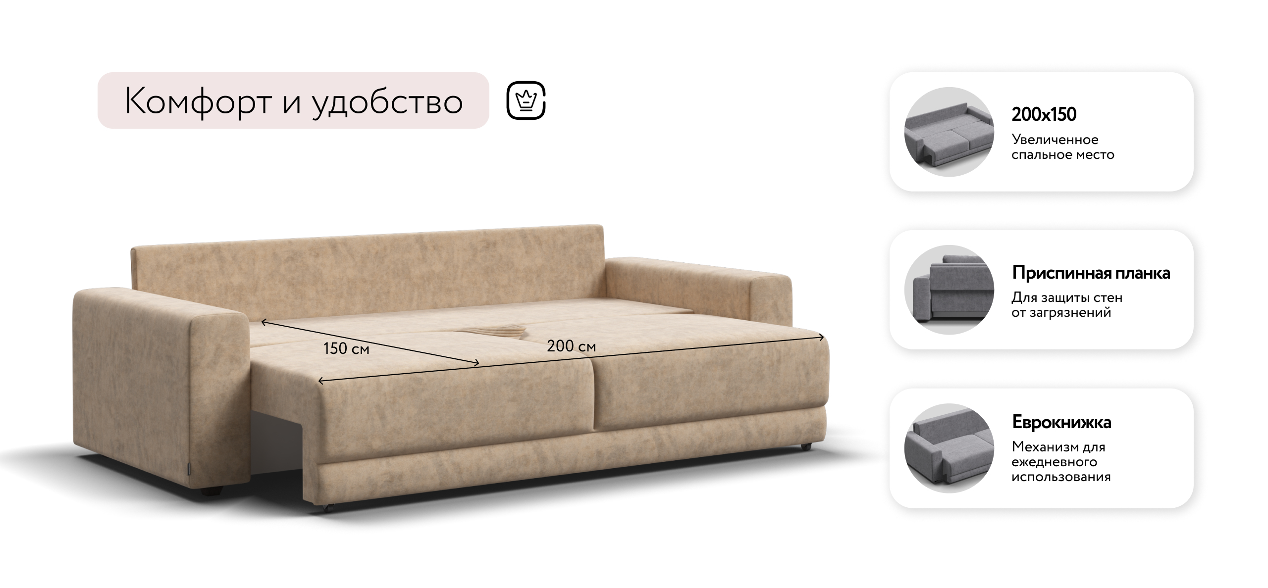 Оснащённый независимым пружинным блоком и высокоэластичной пеной Эластик Фоам с дополнительным слоем периотека, диван гарантирует анатомическую поддержку и комфортный сон. Простой и надёжный механизм трансформации «еврокнижка» позволяет легко преобразовать диван в просторное спальное место.