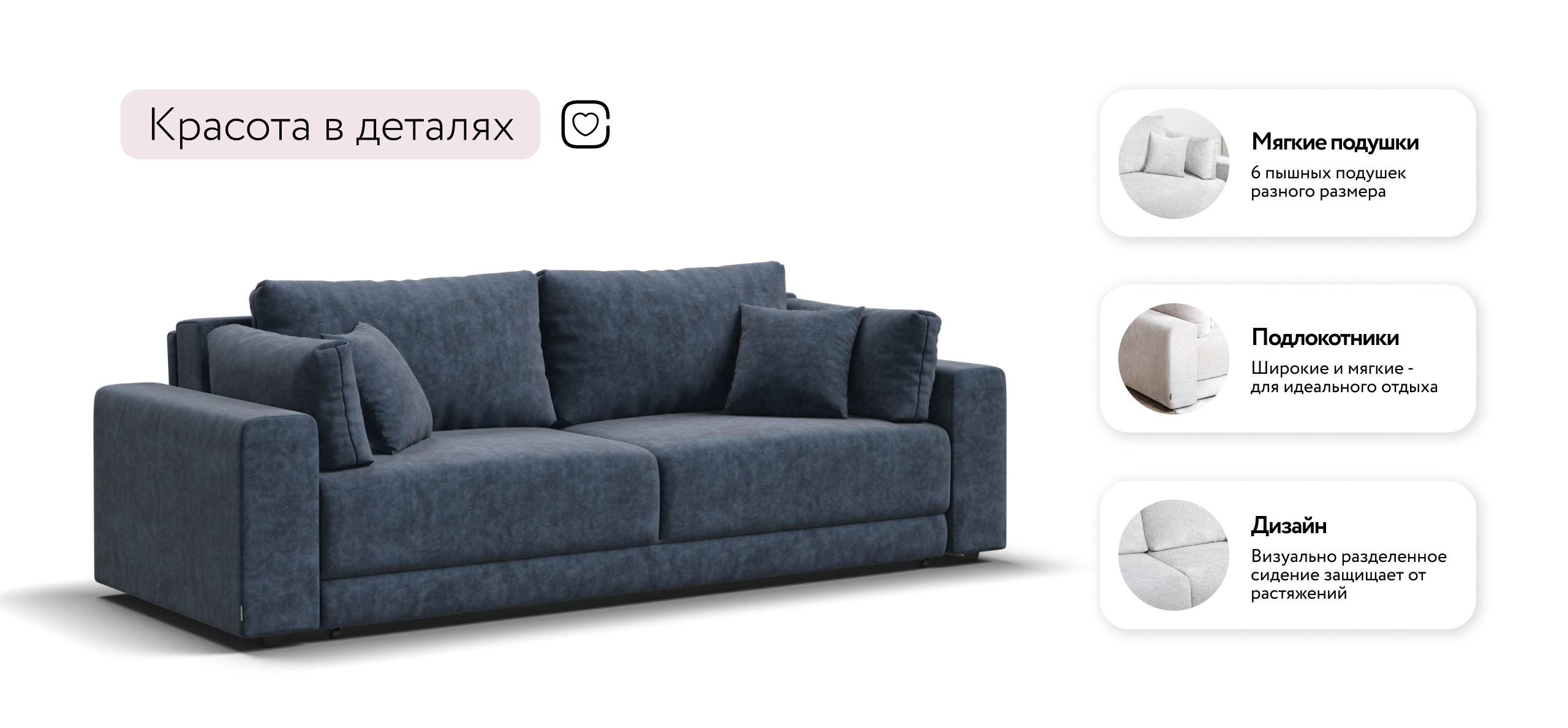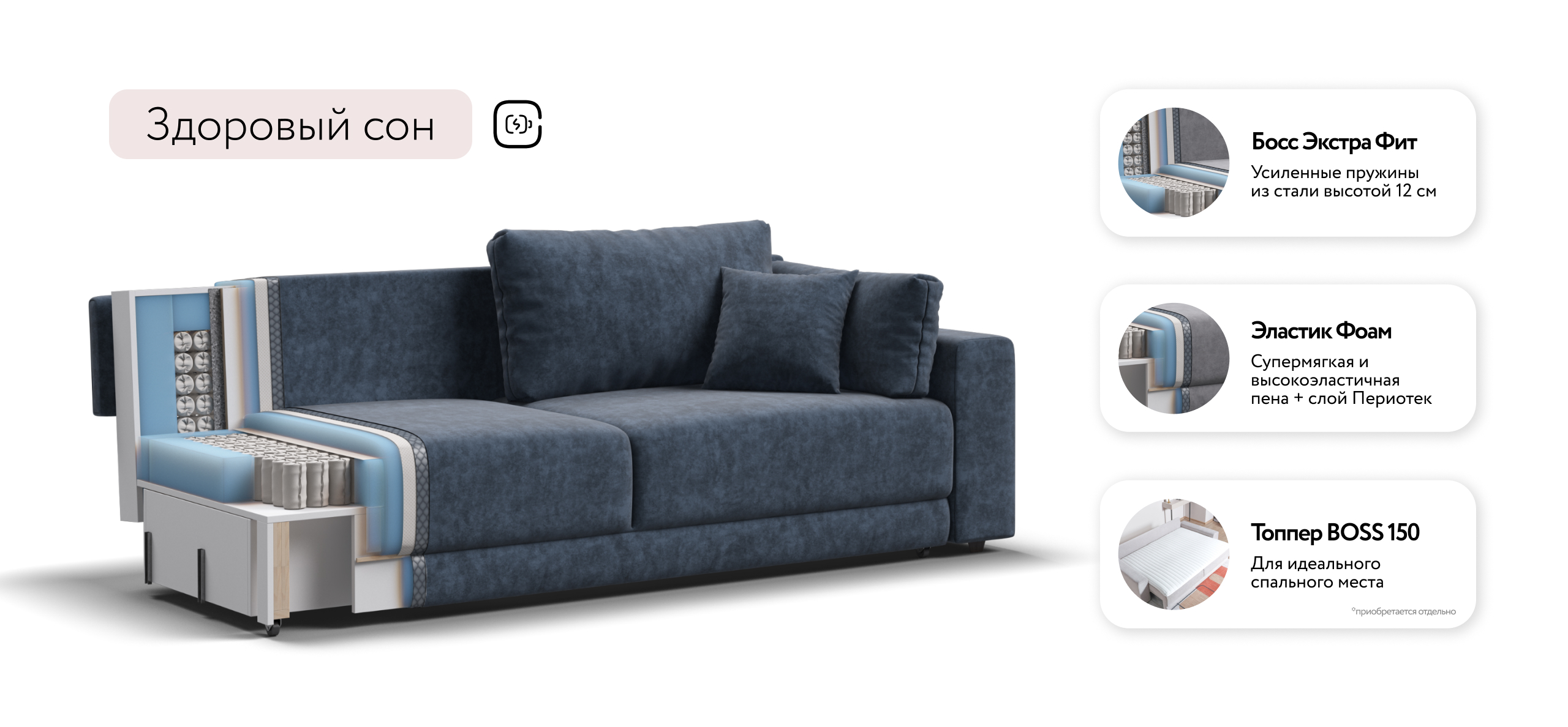 Босс Прайм — это сочетание современного дизайна и продуманной эргономики, создающее уютную атмосферу в любом интерьере. Визуально разделённое сиденье, широкие мягкие подлокотники и пышные подушки разного размера обеспечивают не только эстетическую привлекательность, но и максимальный комфорт.