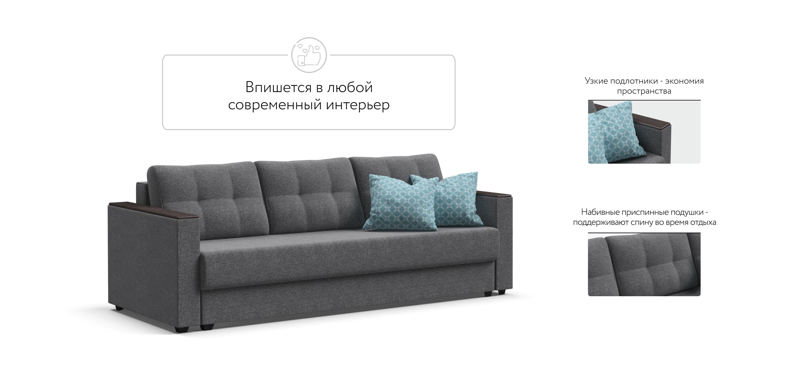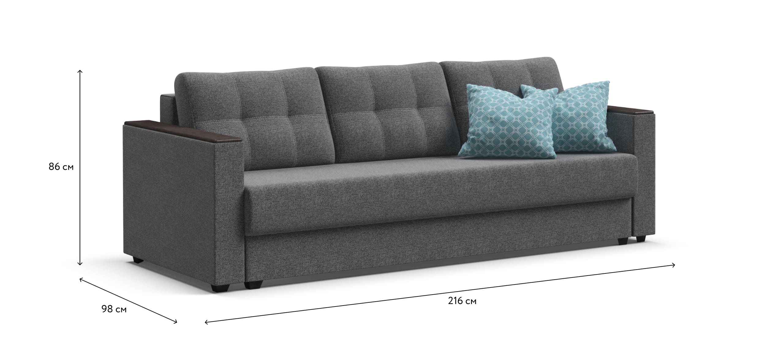 Диван Атланта, благодаря небольшим габаритам подойдет как для маленькой комнаты, так и для дачи. Оптимальный для ежедневного использования механизм трансформации Еврокнижка, за считанные секунды, поможет превратить диван в полноценное спальное место. Диван имеет удобные подлокотники из МДФ, на которые можно поставить чашку при отдыхе. Мягкие приспинные подушки, наполненные холлофайбером и дробленой пеной, обеспечат комфорт во время сидения.