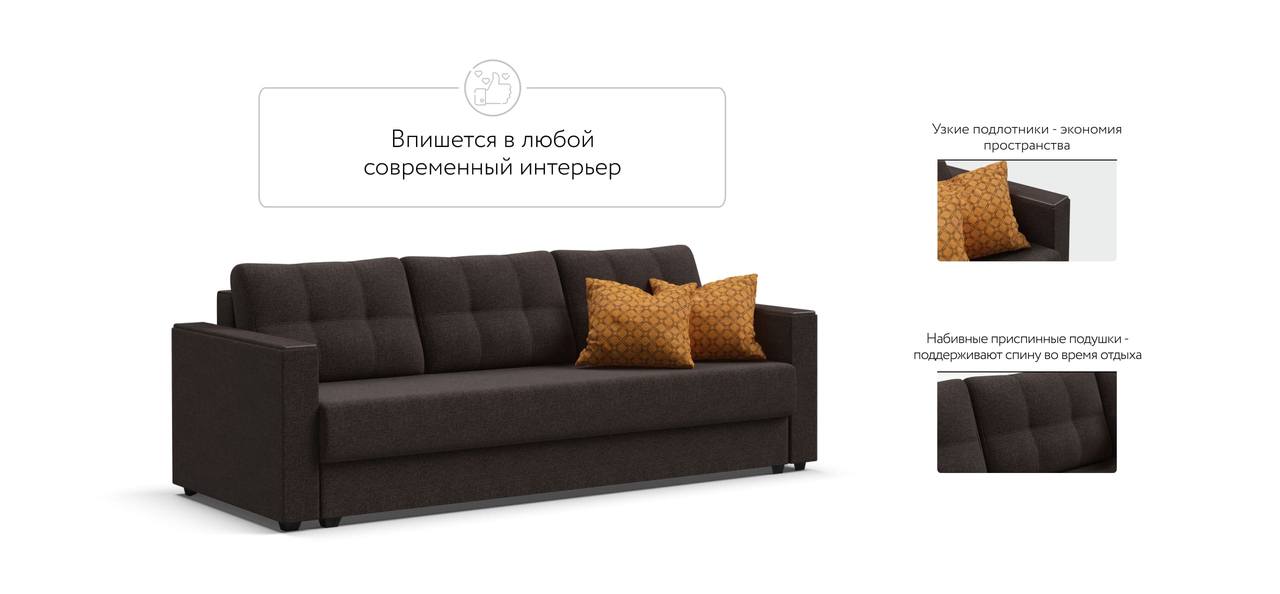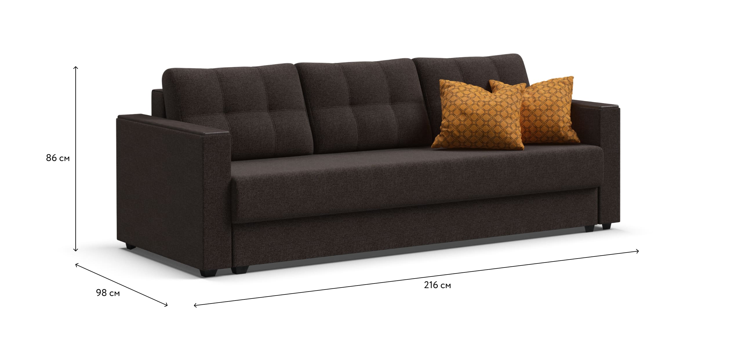 Диван Атланта, благодаря небольшим габаритам подойдет как для маленькой комнаты, так и для дачи. Оптимальный для ежедневного использования механизм трансформации Еврокнижка, за считанные секунды, поможет превратить диван в полноценное спальное место. Диван имеет удобные подлокотники из МДФ, на которые можно поставить чашку при отдыхе. Мягкие приспинные подушки, наполненные холлофайбером и дробленой пеной, обеспечат комфорт во время сидения.