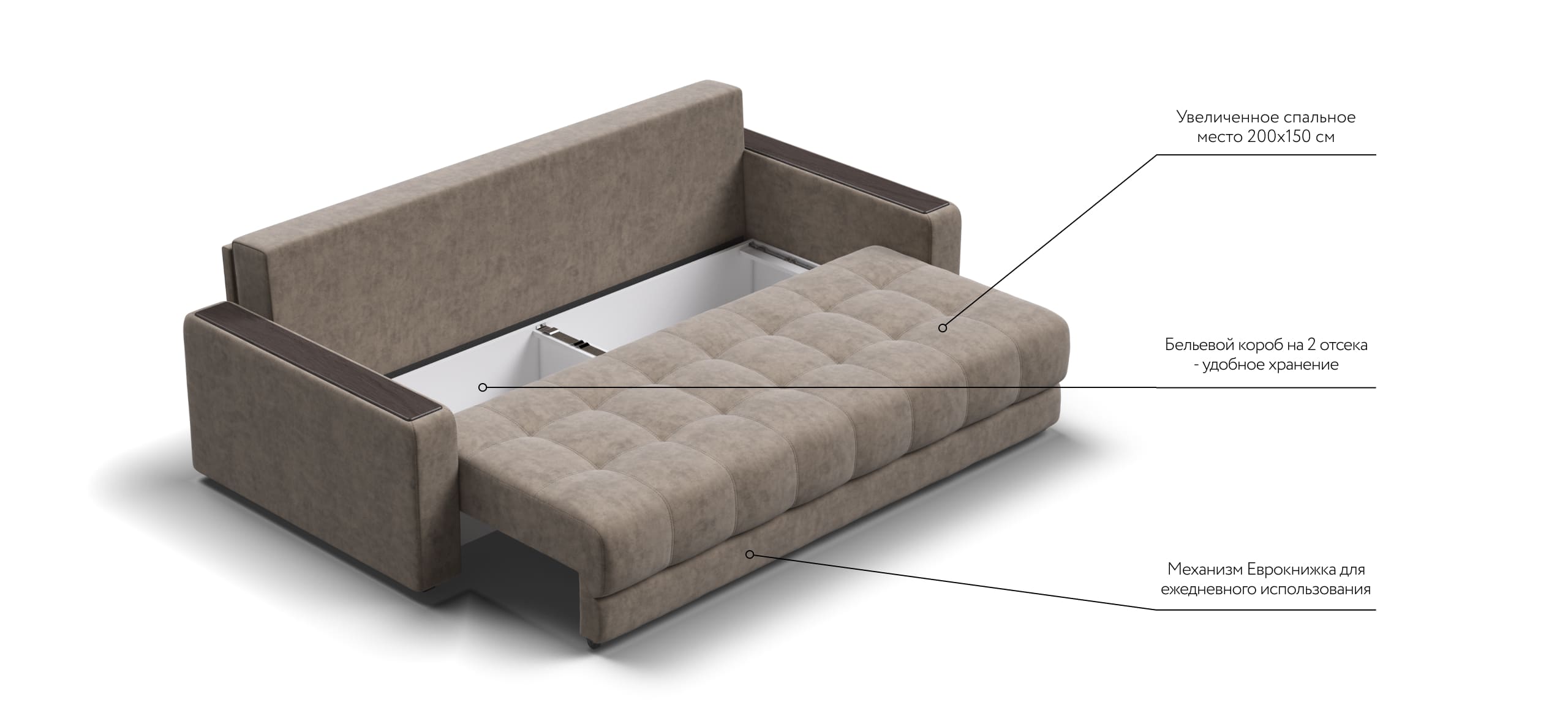 Легкая трансформация в три положения создаст для Вас максимально комфортный отдых, а улучшенное анатомическое основание в диване обеспечит Вам здоровый сон. Спинка защищает от соприкосновения со стеной во время сна.