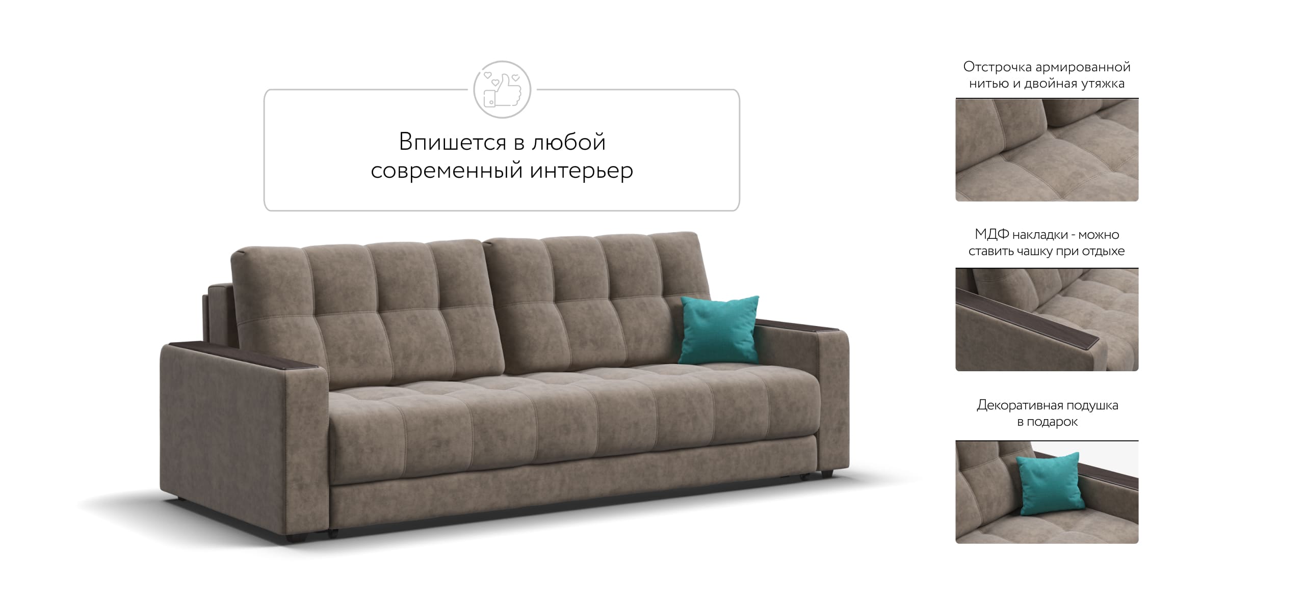 Декоративная строчка армированной нитью и двойная утяжка надолго сохранит внешний вид дивана.