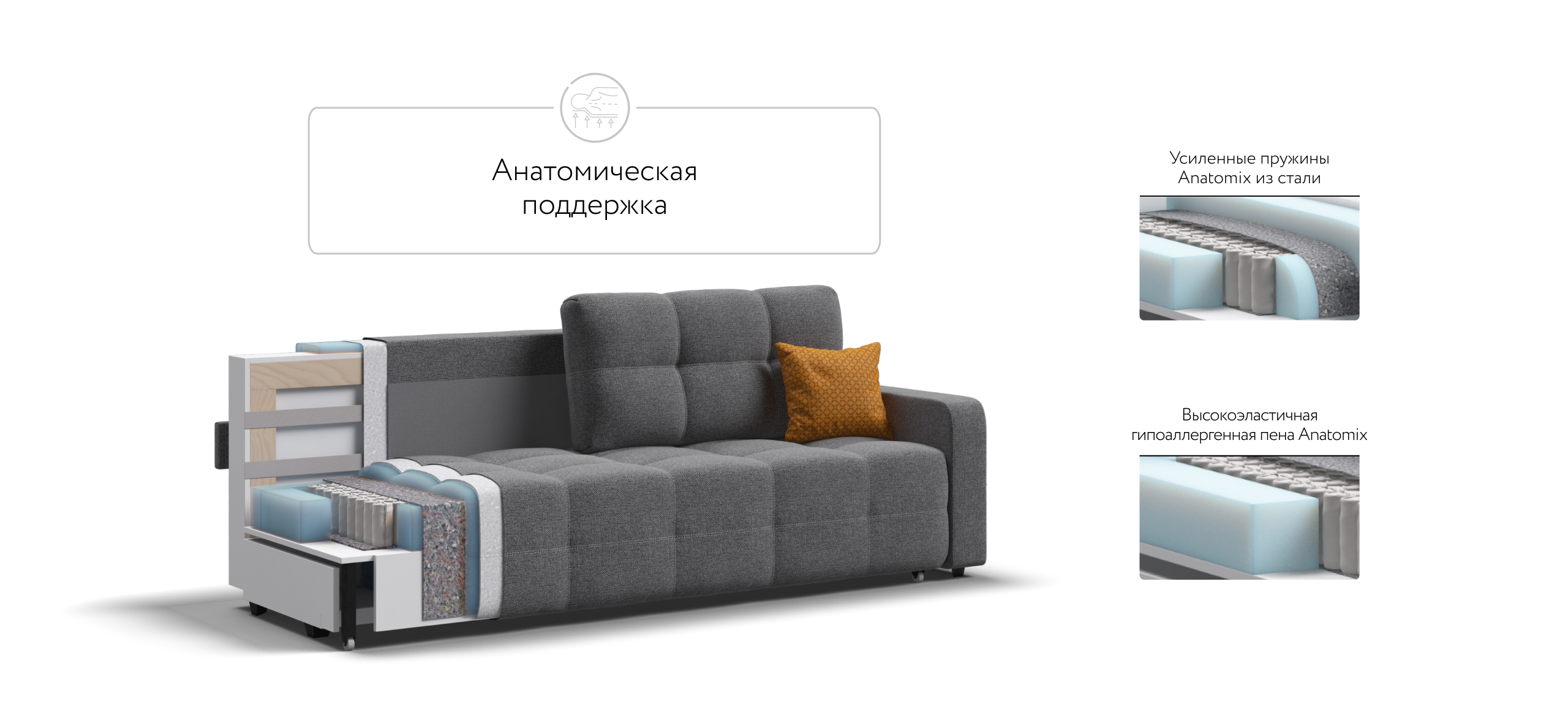 Простой и надежный механизм трансформации еврокнижка позволяет с легкостью раскладывать диван в удобную, полноценную, двуспальную кровать с идеально ровным спальным местом.
