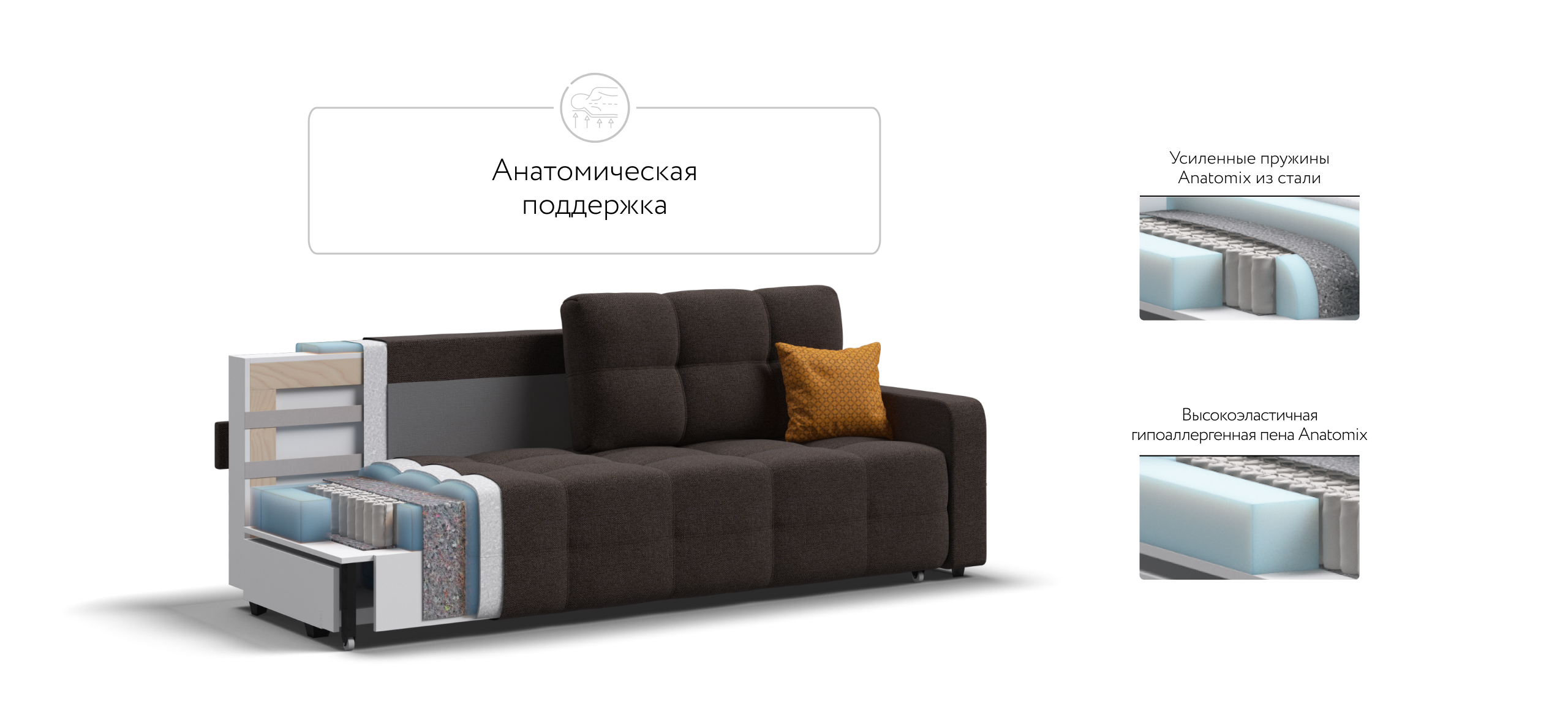 Простой и надежный механизм трансформации еврокнижка позволяет с легкостью раскладывать диван в удобную, полноценную, двуспальную кровать с идеально ровным спальным местом.