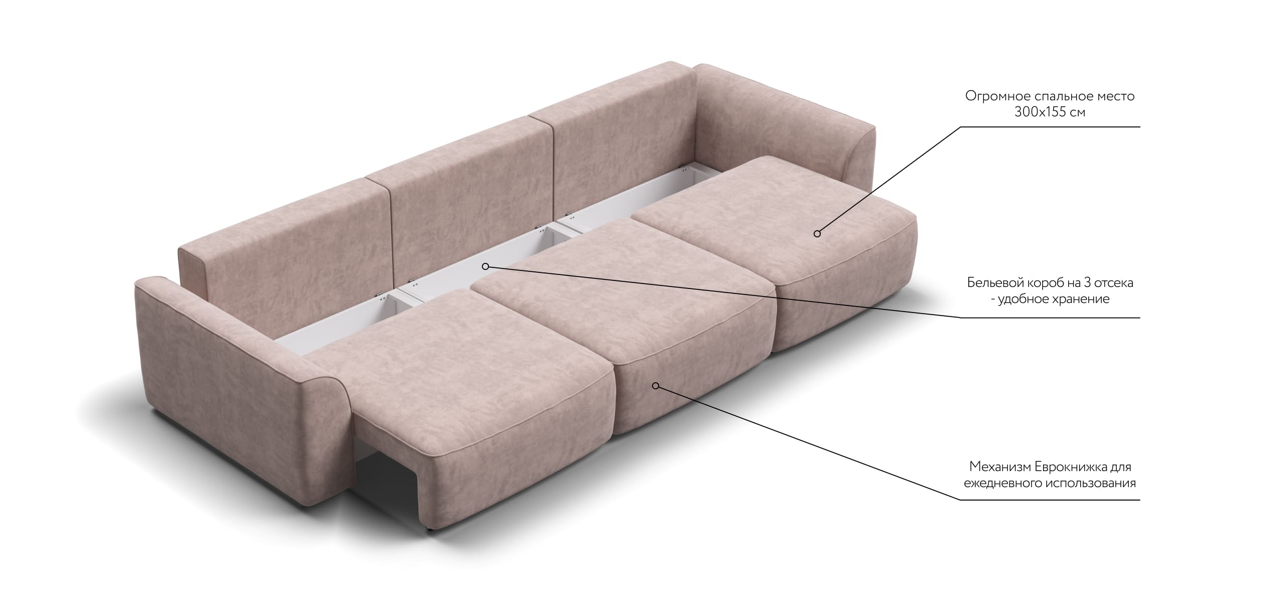 Приглашайте в гости большую компанию - диван вместит всех! Каждое посадочное место можно выдвинуть вперед и получить диван с правым или левым углом, а также получить П-образную форму дивана. А в разложенном виде диван превращается в огромное спальное место.