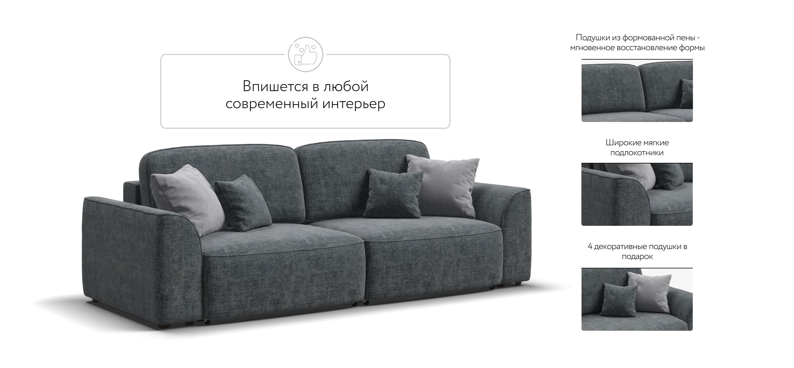 Комфортная посадка, скругленные линии, объемные подушки - диван, который наполнит ваш дом уютом и комфортом. Каждое посадочное место можно выдвинуть вперед и получить угловой диван, на котором с комфортом разместится небольшая компания. А в разложенном виде диван превращается в комфортное спальное место.