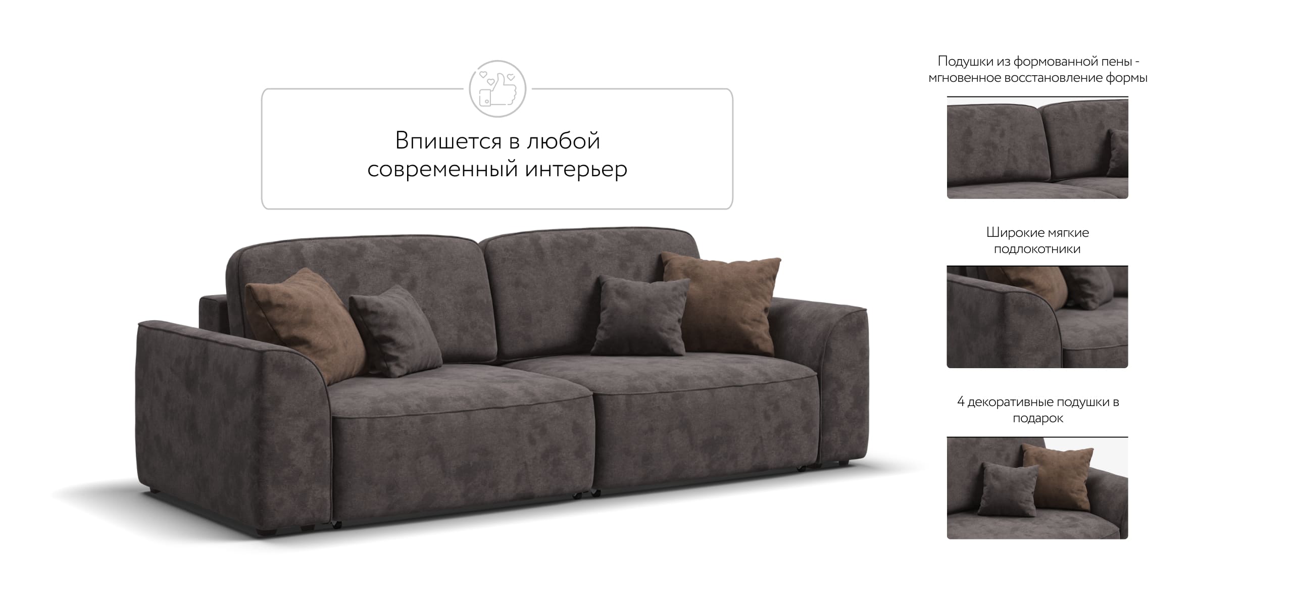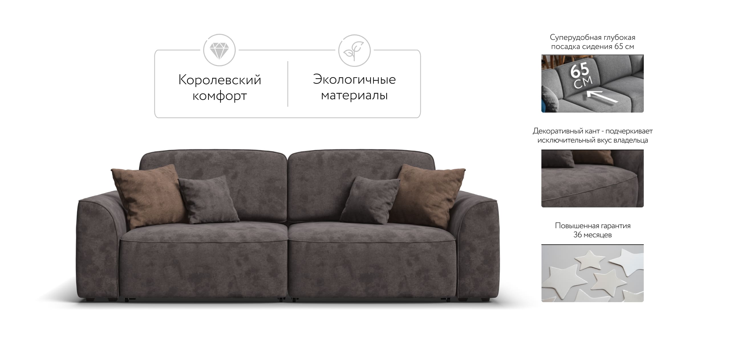 Комфортная посадка, скругленные линии, объемные подушки - диван, который наполнит ваш дом уютом и комфортом. Каждое посадочное место можно выдвинуть вперед и получить угловой диван, на котором с комфортом разместится небольшая компания. А в разложенном виде диван превращается в комфортное спальное место.