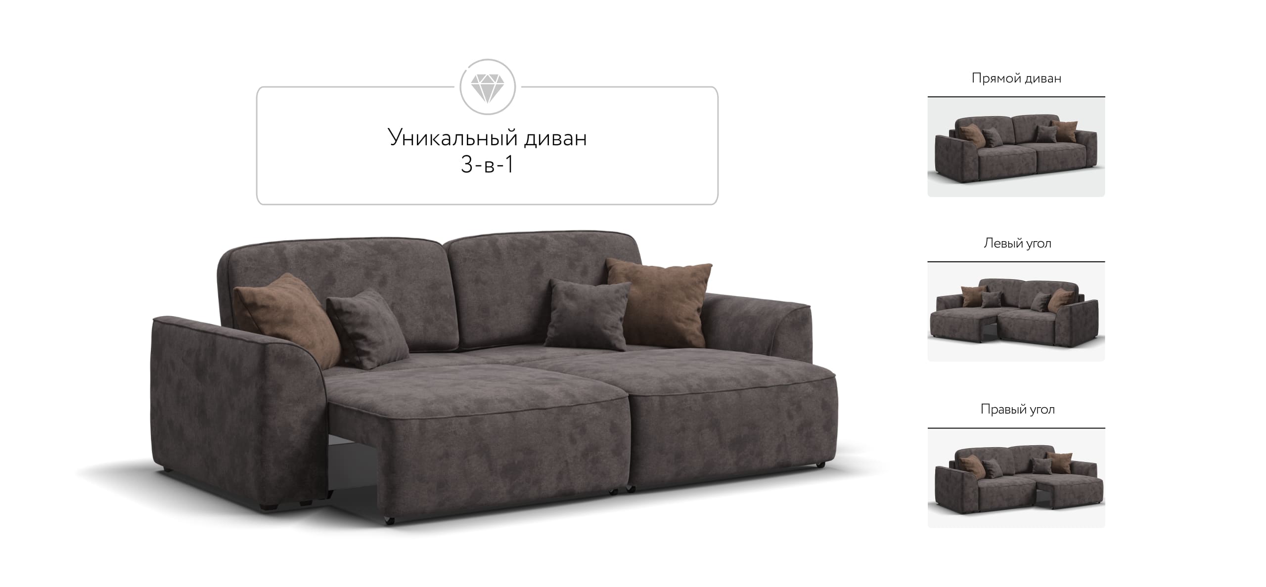 Уникальный диван 3-в-1: прямой, левый угол, правый угол.