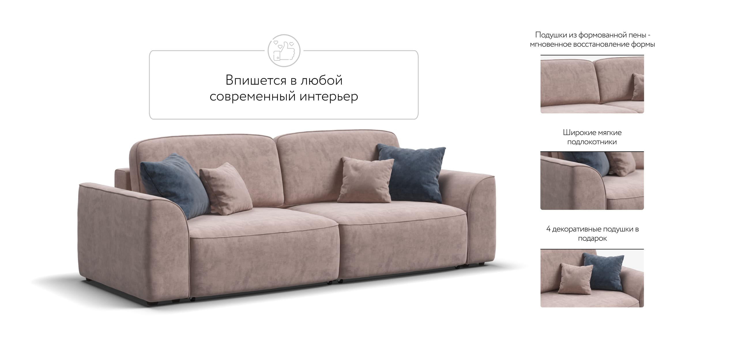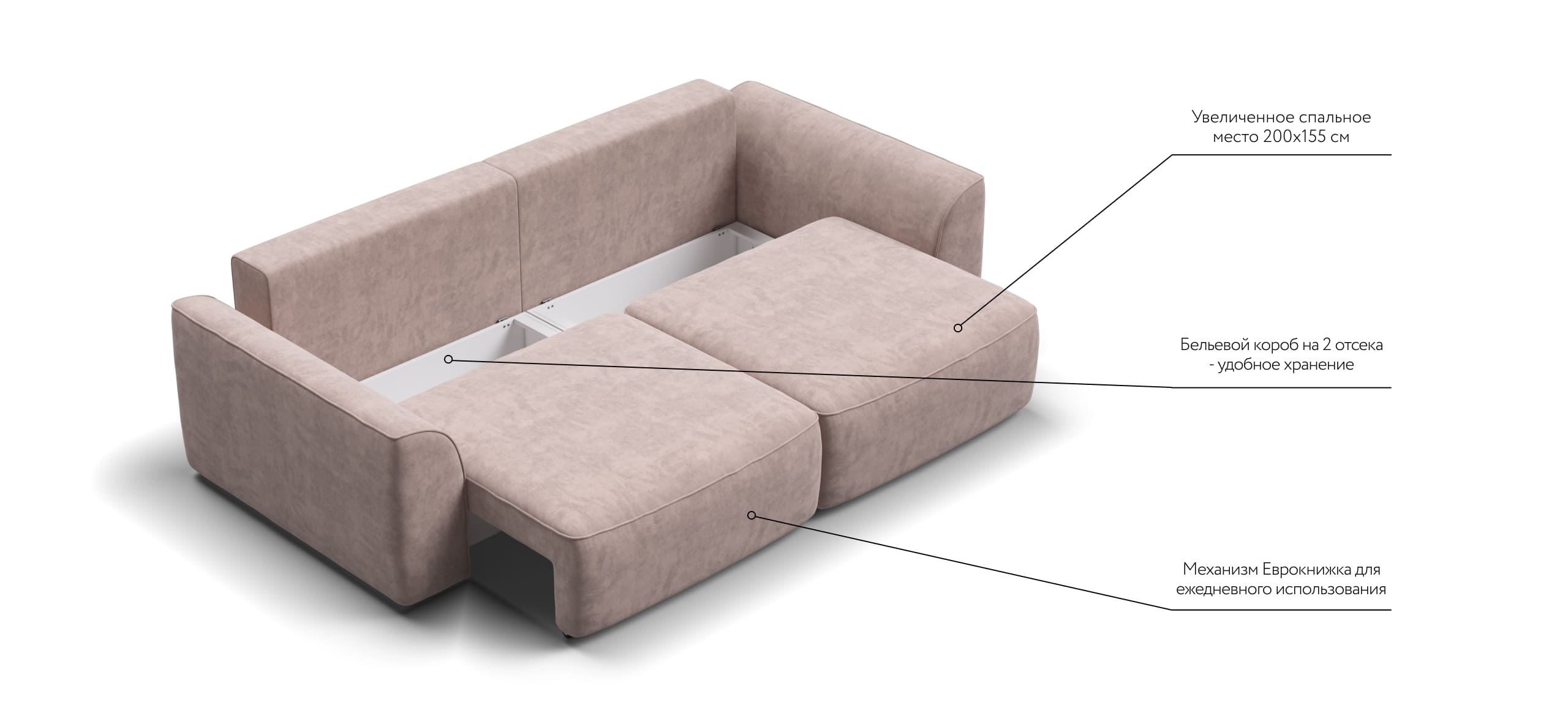 Комфортная посадка, скругленные линии, объемные подушки - диван, который наполнит ваш дом уютом и комфортом. Каждое посадочное место можно выдвинуть вперед и получить угловой диван, на котором с комфортом разместится небольшая компания. А в разложенном виде диван превращается в комфортное спальное место.