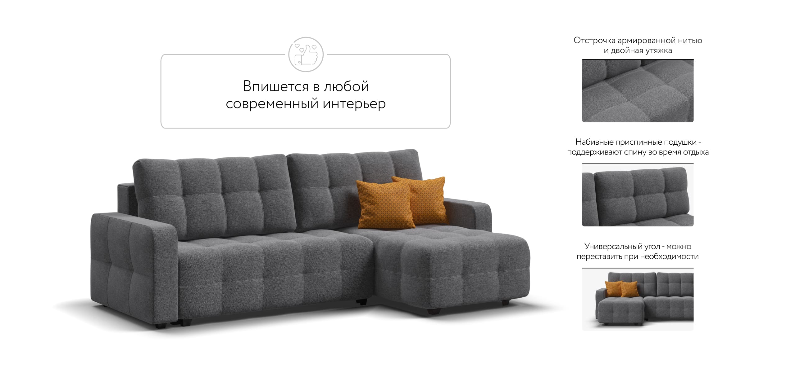 Угловой диван Dandy Euro - с ним так легко создать настоящий уют и домашний комфорт. Мягкие приспинные подушки и независимый пружинный блок в основании обеспечат максимальный комфорт во время отдыха.