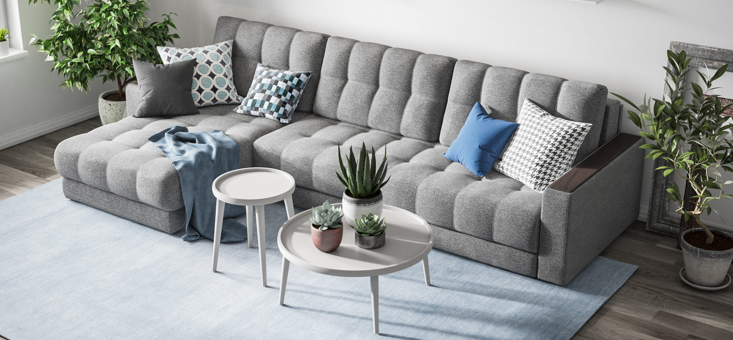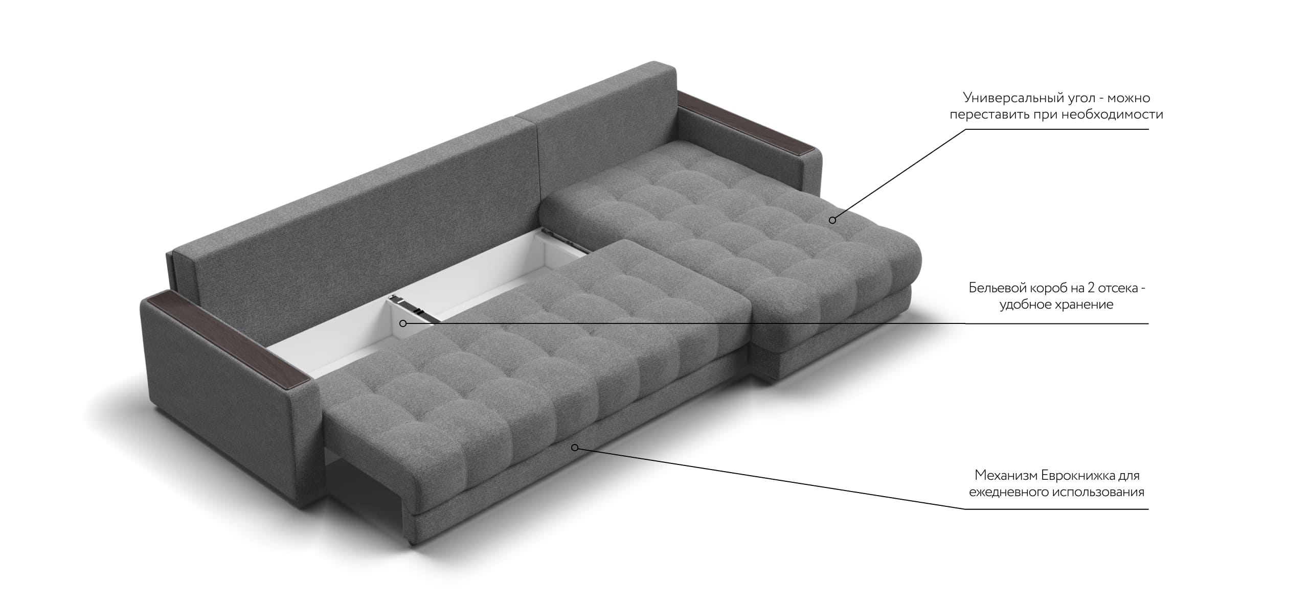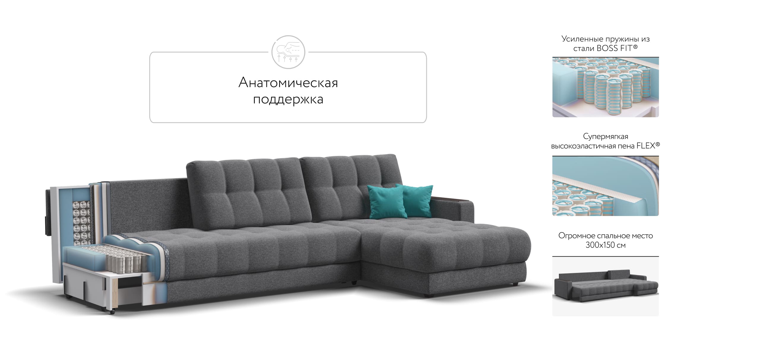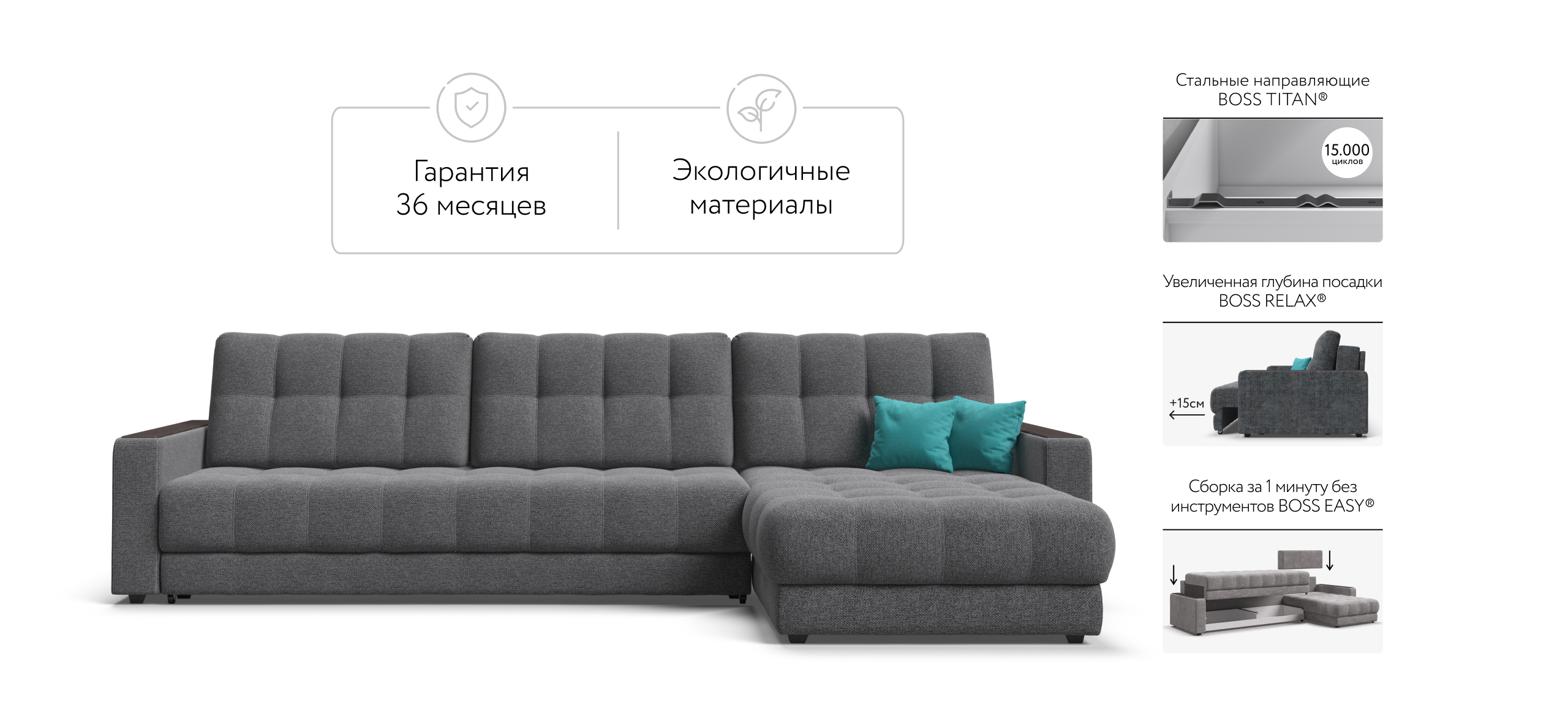 Угловой диван BOSS MAX - большой, стильный и комфортный диван, предназначенный для просторной комнаты. Продуманный до мелочей диван BOSS сочетает в себе надежный каркас, мягкие ткани, многофункциональность и быструю сборку за 1 минуту без инструментов - ощутите комфорт у себя дома!