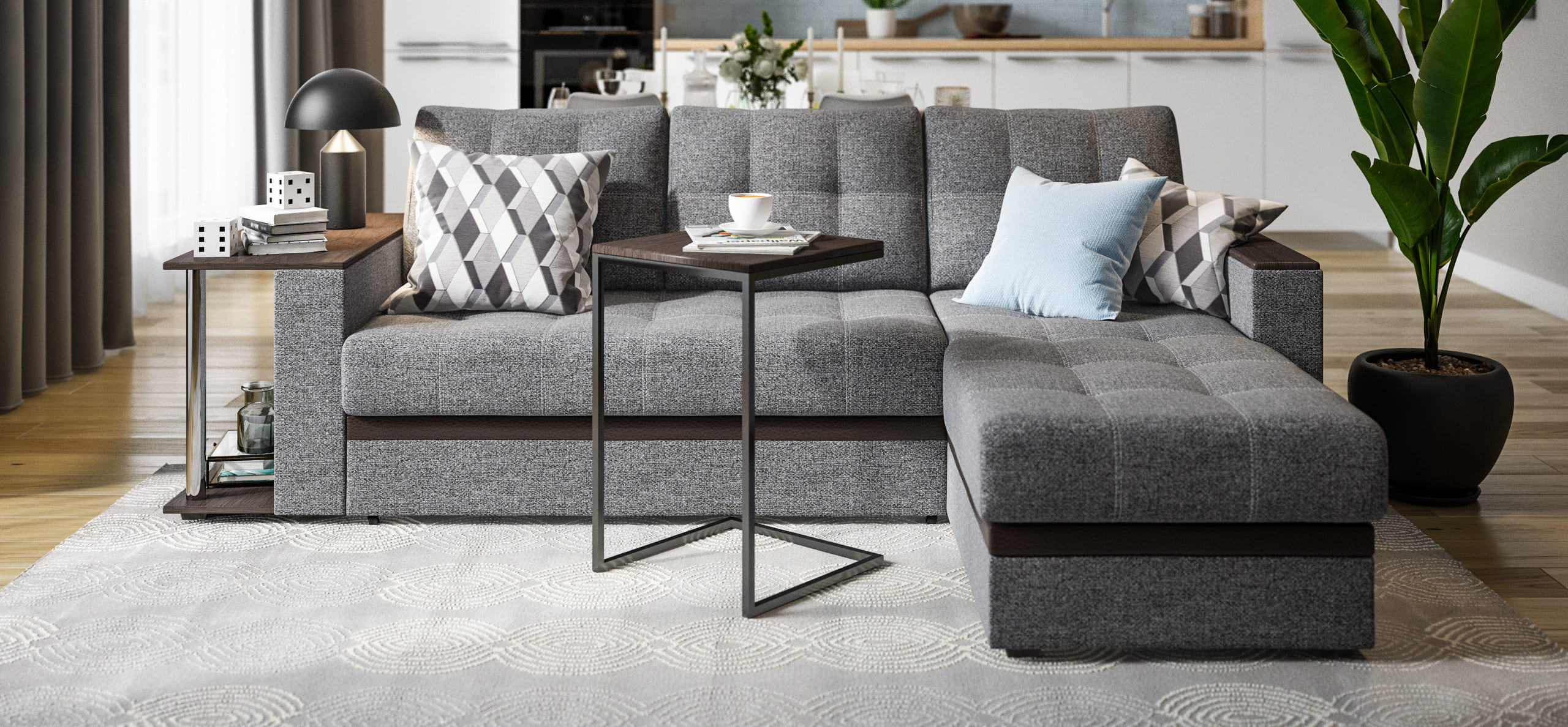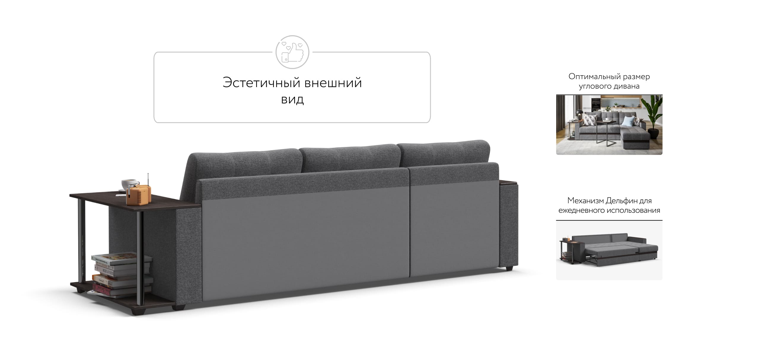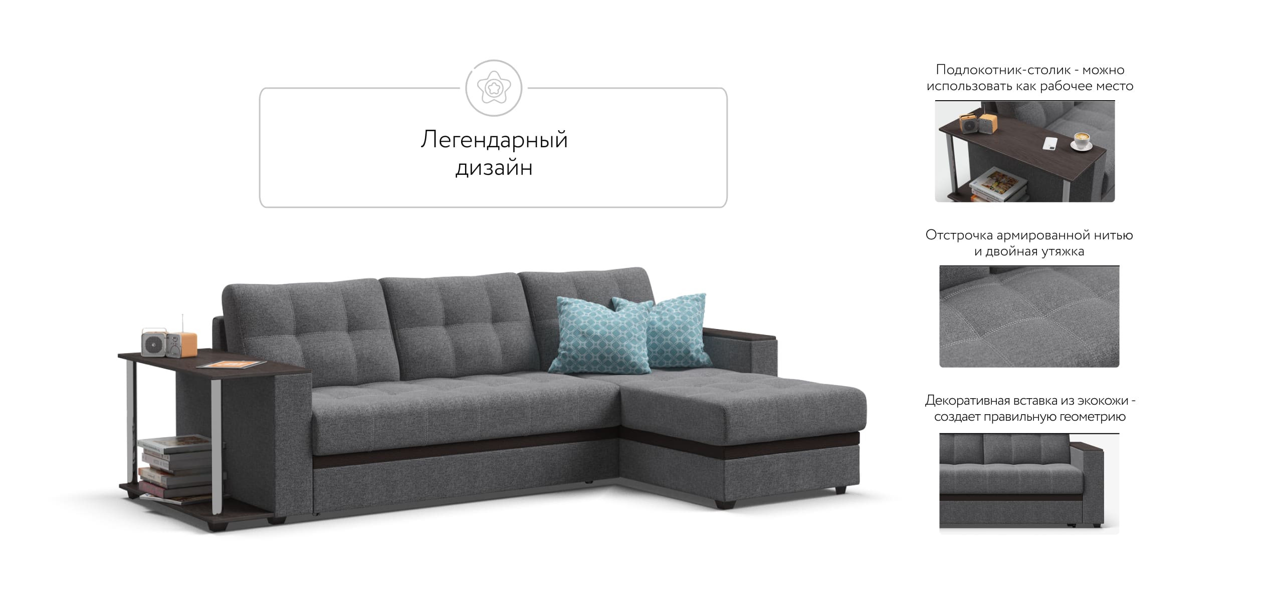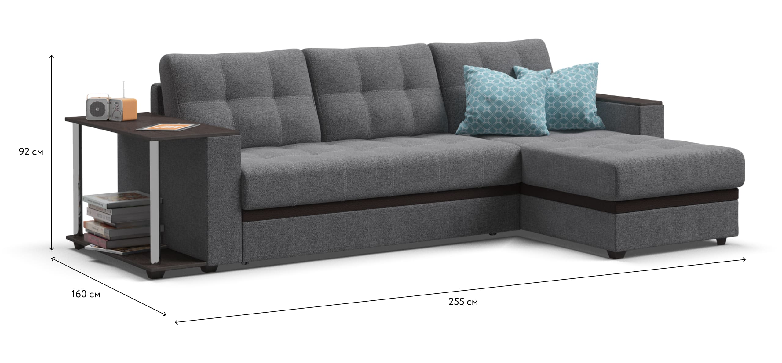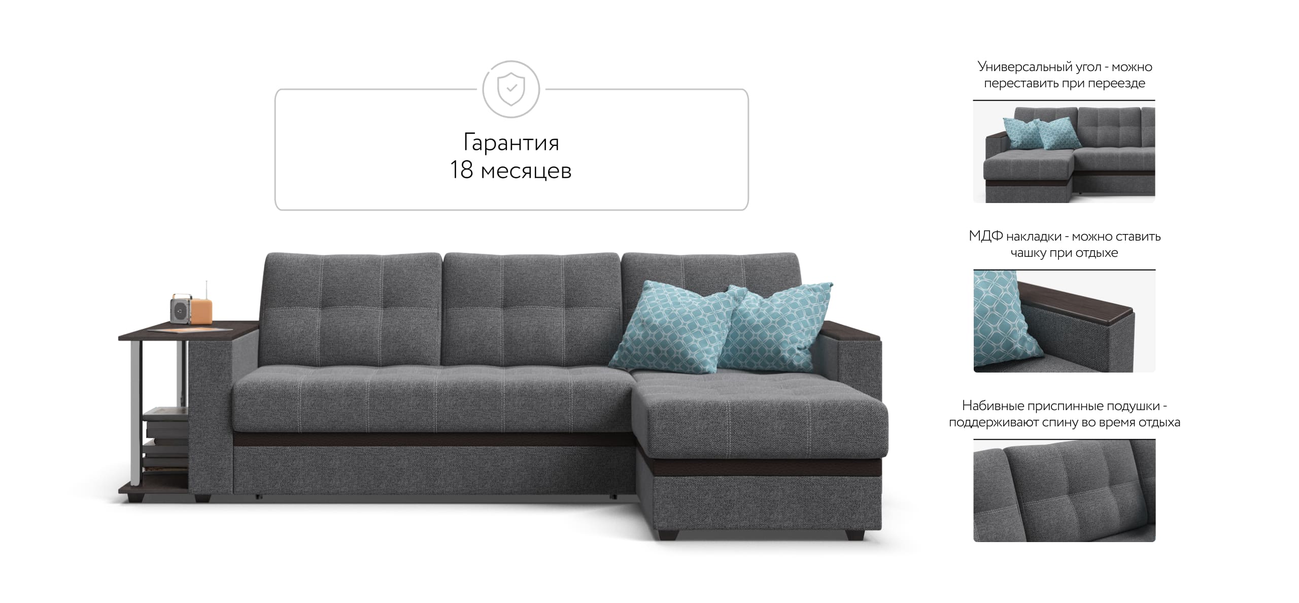 Угловой диван Атланта, благодаря своему элегантному и практичному дизайну, замечательно дополнит интерьер Вашей гостиной. Надежный и простой механизм трансформации Дельфин идеален для постоянного использования и выдерживает большие нагрузки. Модель оснащена прорезиненными колесиками, что обеспечит вам легкость раскладки и обезопасит от повреждений напольное покрытие.