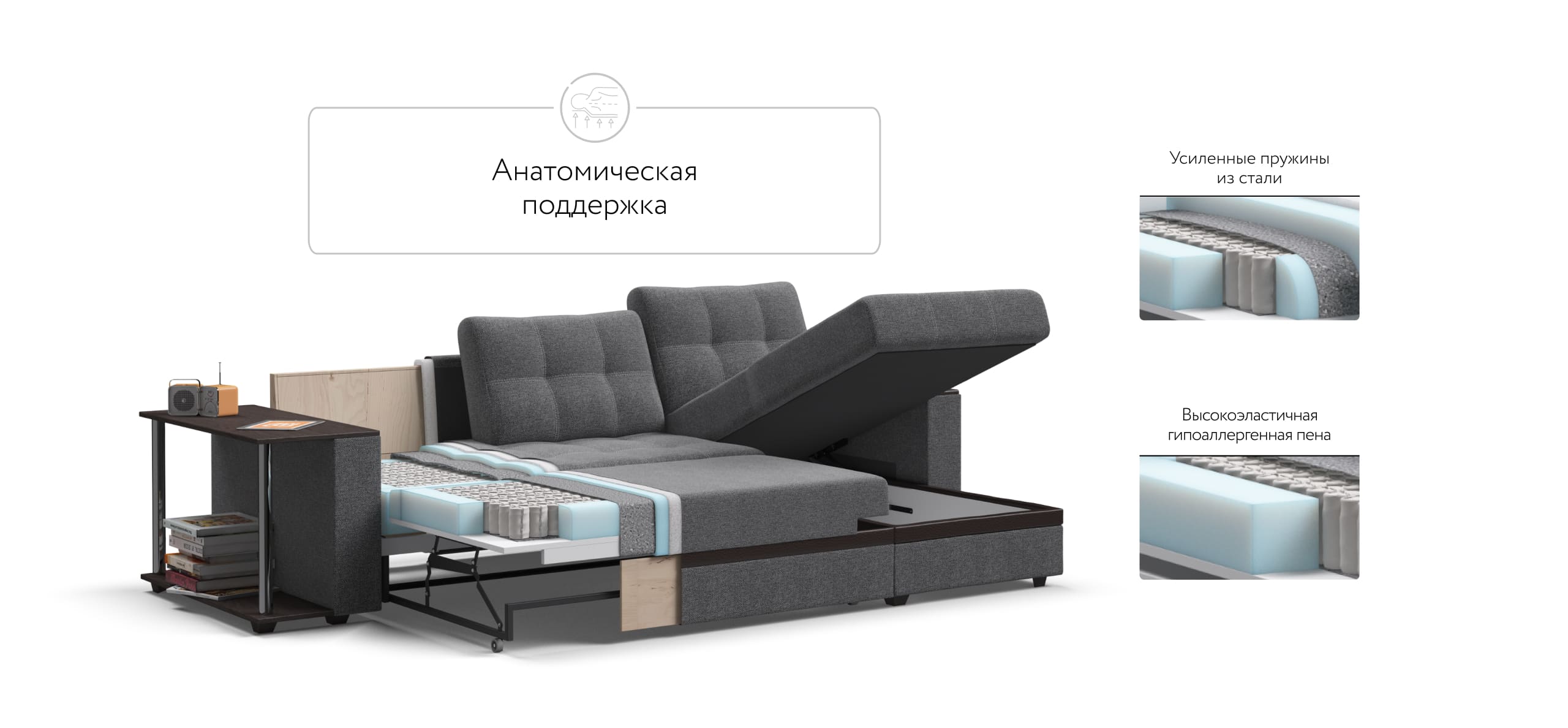 Не прилагая особых усилий, диван легко превратить в комфортную двуспальную кровать с идеально ровным спальным местом. Выкатная часть выполнена на независимом пружинном блоке, обивка в основной ткани. Задняя часть спинки дивана частично выполнена в технической ткани.