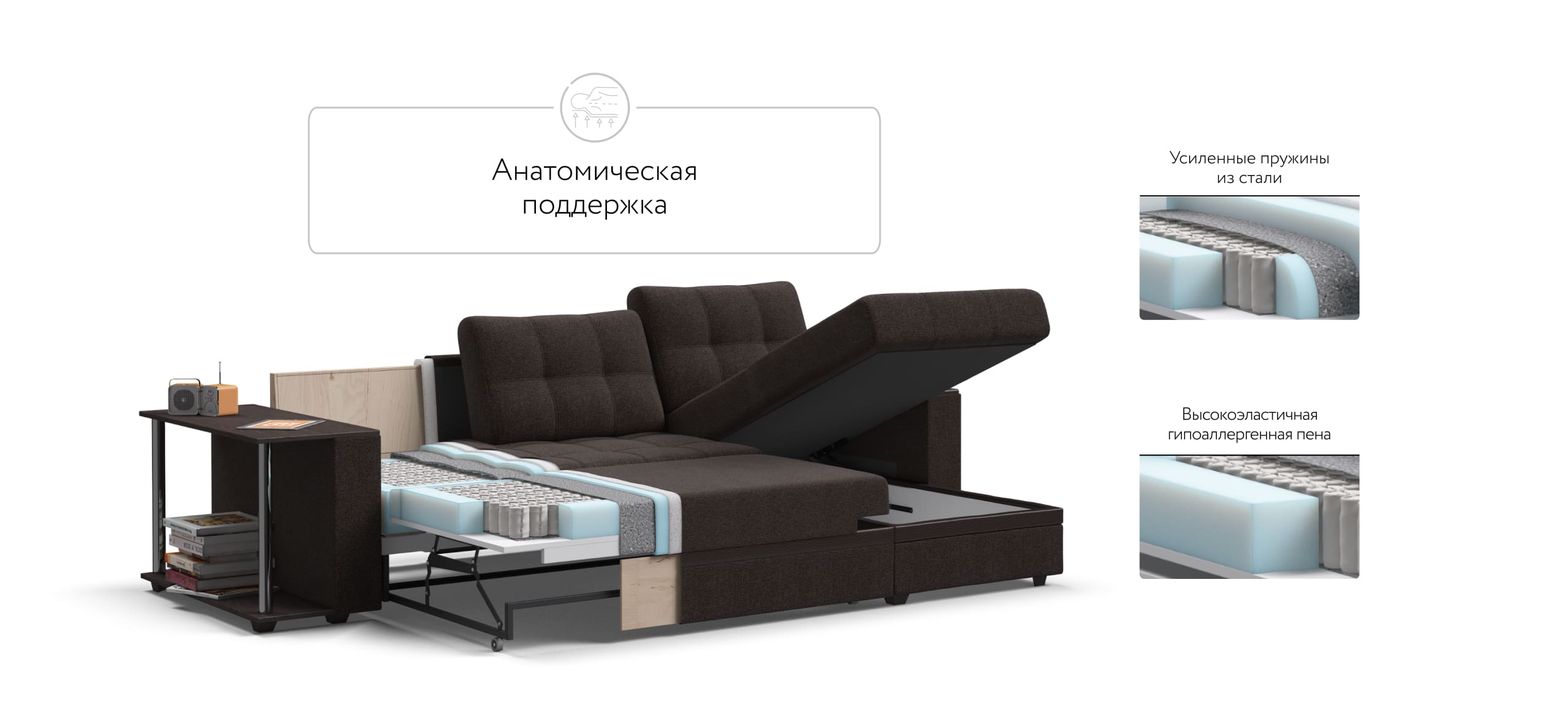 Не прилагая особых усилий, диван легко превратить в комфортную двуспальную кровать с идеально ровным спальным местом. Выкатная часть выполнена на независимом пружинном блоке, обивка в основной ткани. Задняя часть спинки дивана частично выполнена в технической ткани.