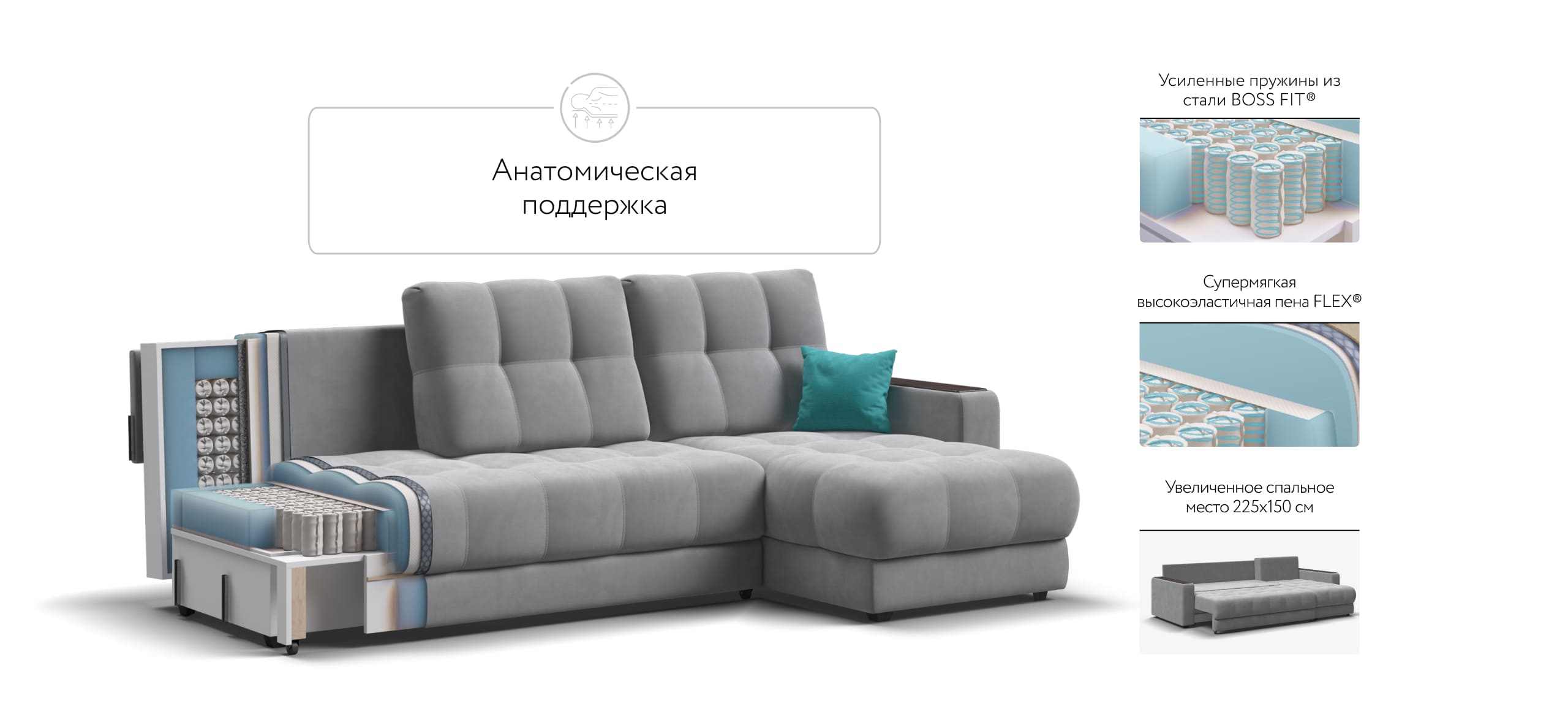 Продуманный до мелочей диван BOSS сочетает в себе мягкие ткани, надежный каркас, качественное наполнение матраса и быструю сборку за 1 минуту без инструментов - ощутите комфорт у себя дома!