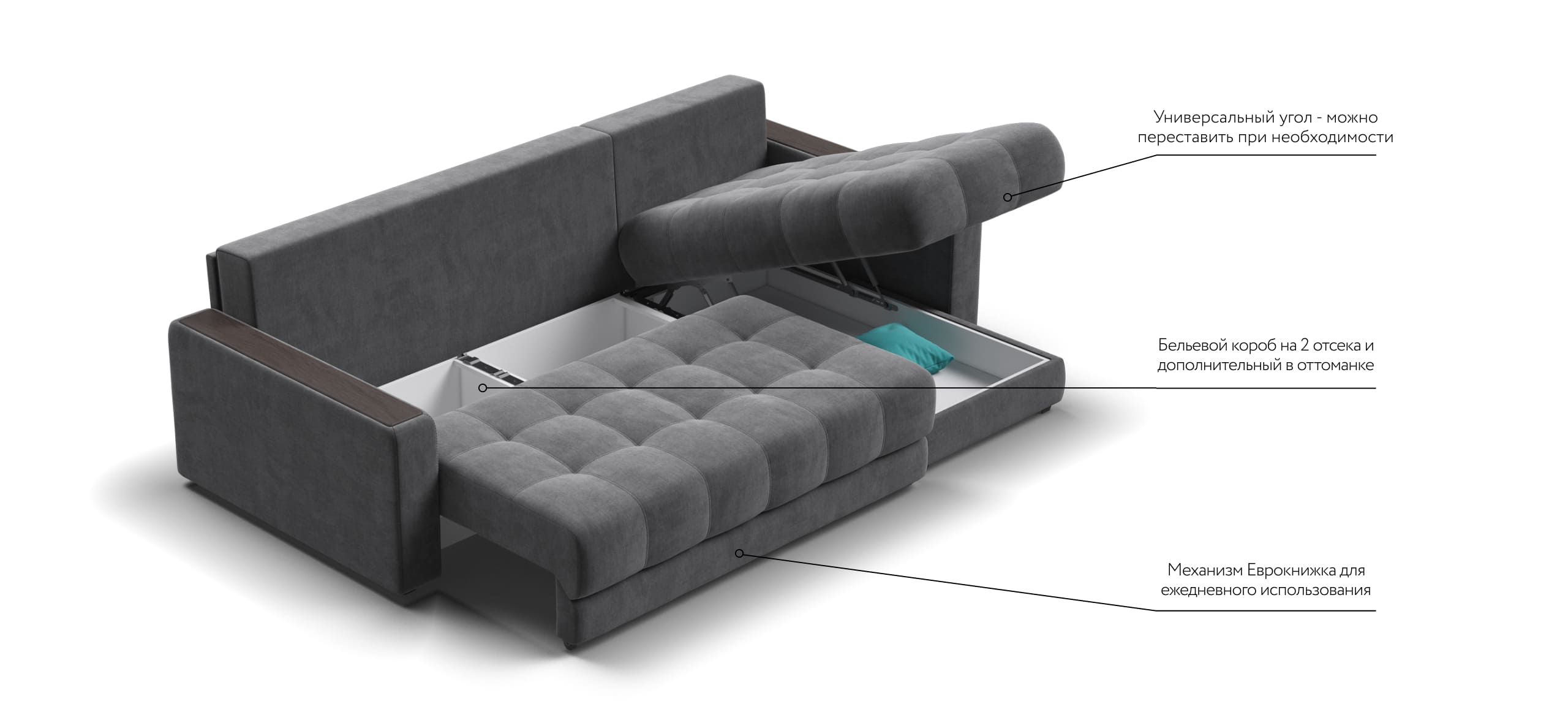 Угловой диван BOSS Classic XL - диван с подъемной оттоманкой и механизмом Еврокнижка.