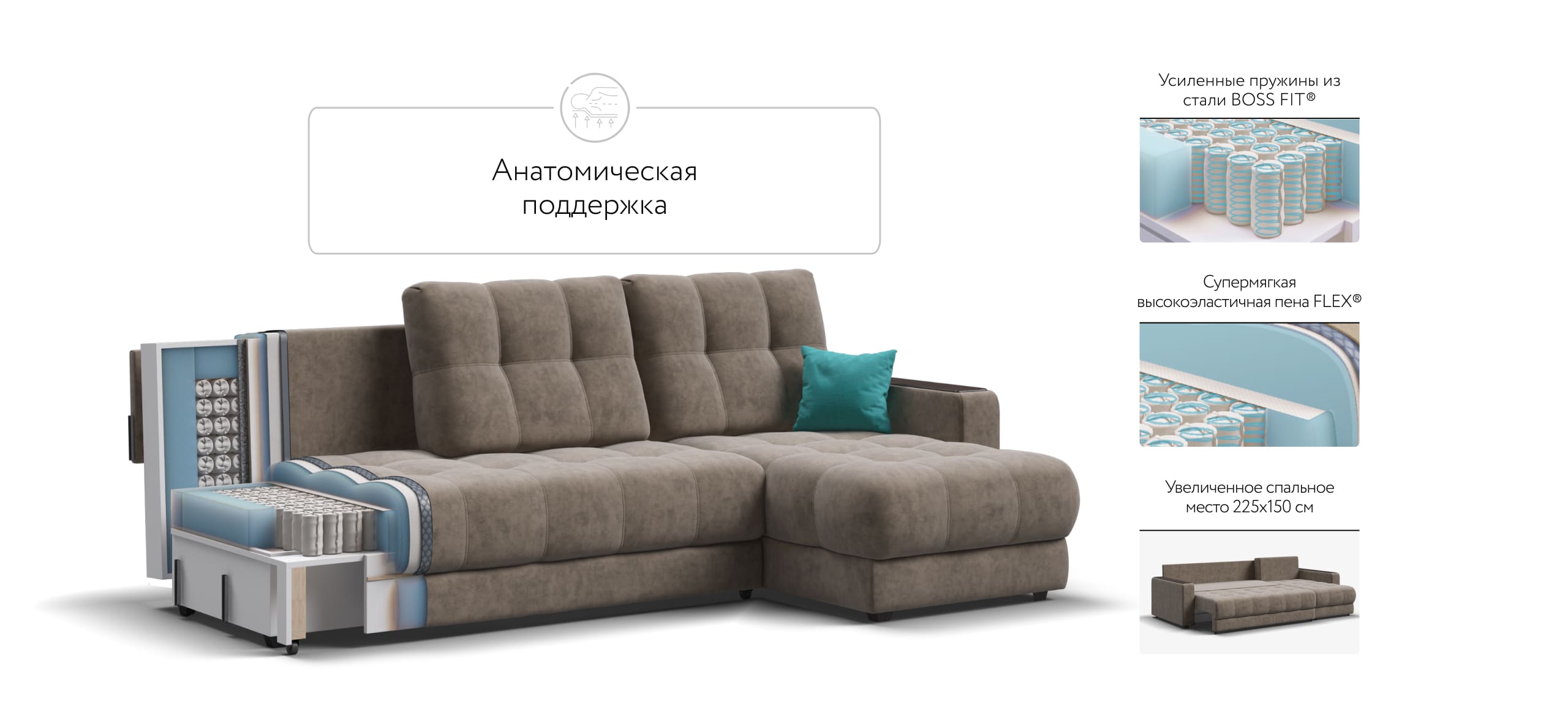 Продуманный до мелочей диван BOSS сочетает в себе мягкие ткани, надежный каркас, качественное наполнение матраса и быструю сборку за 1 минуту без инструментов - ощутите комфорт у себя дома!