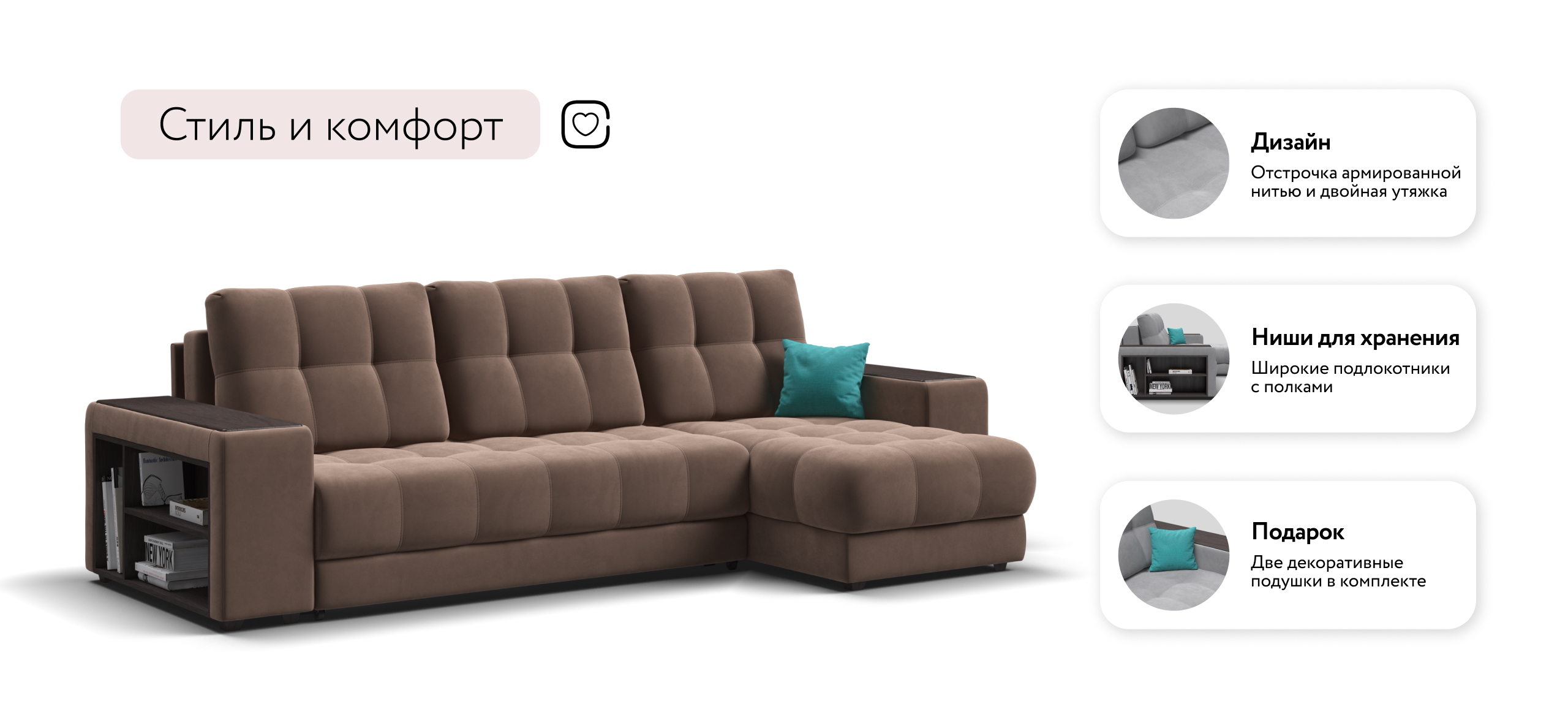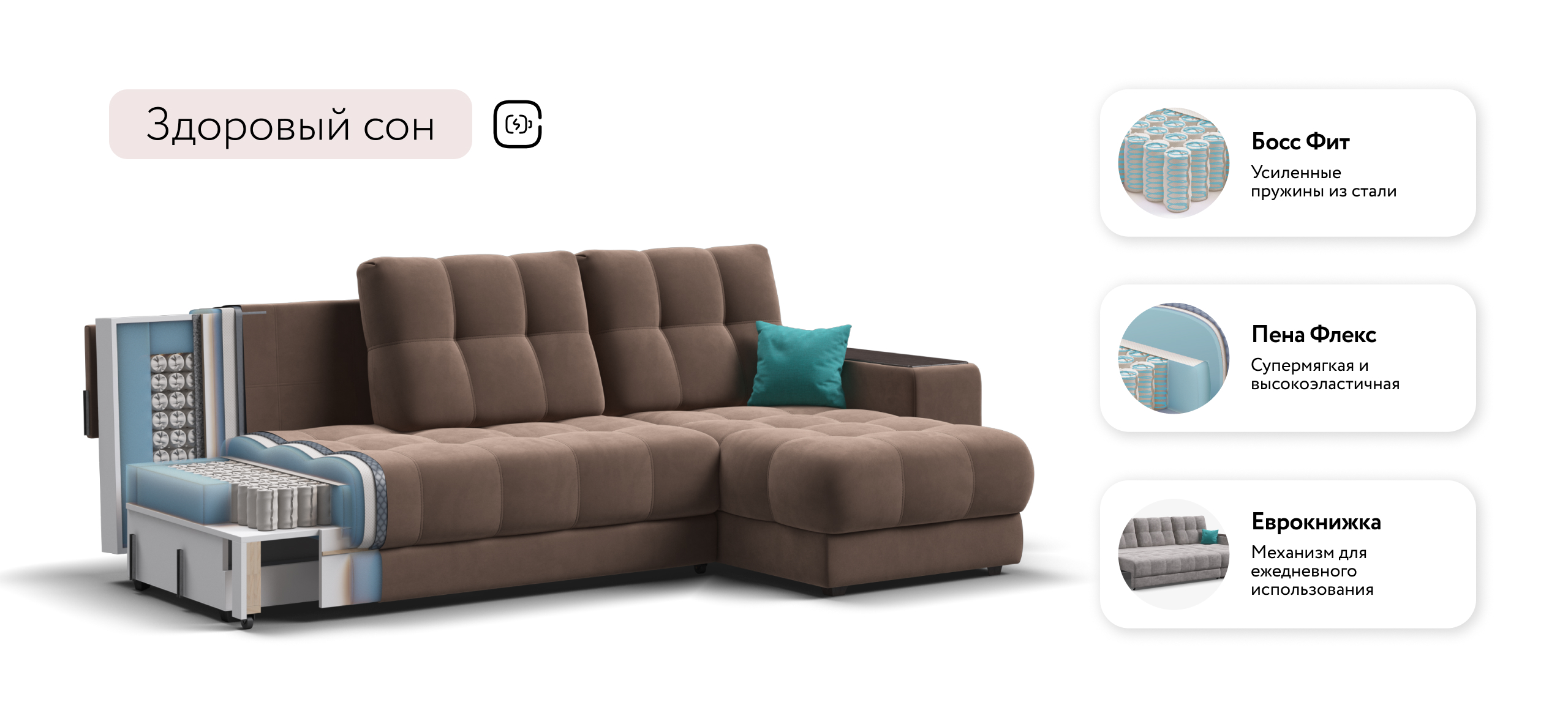 Продуманный до мелочей диван BOSS сочетает в себе функциональный подлокотник, мягкие ткани, надежный каркас, качественное наполнение матраса и быструю сборку за 1 минуту без инструментов - ощутите комфорт у себя дома!