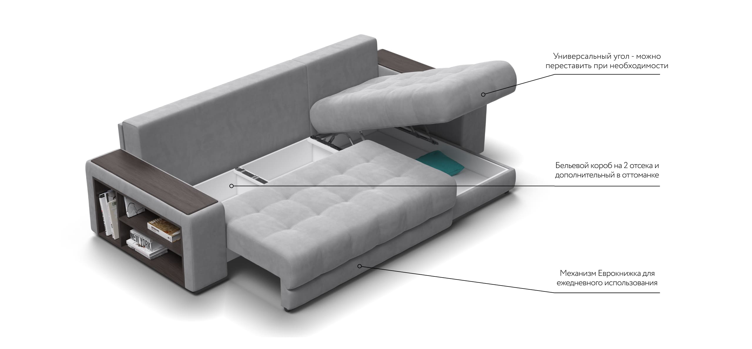 Угловой диван BOSS XL - диван с подъемной оттоманкой и механизмом Еврокнижка.