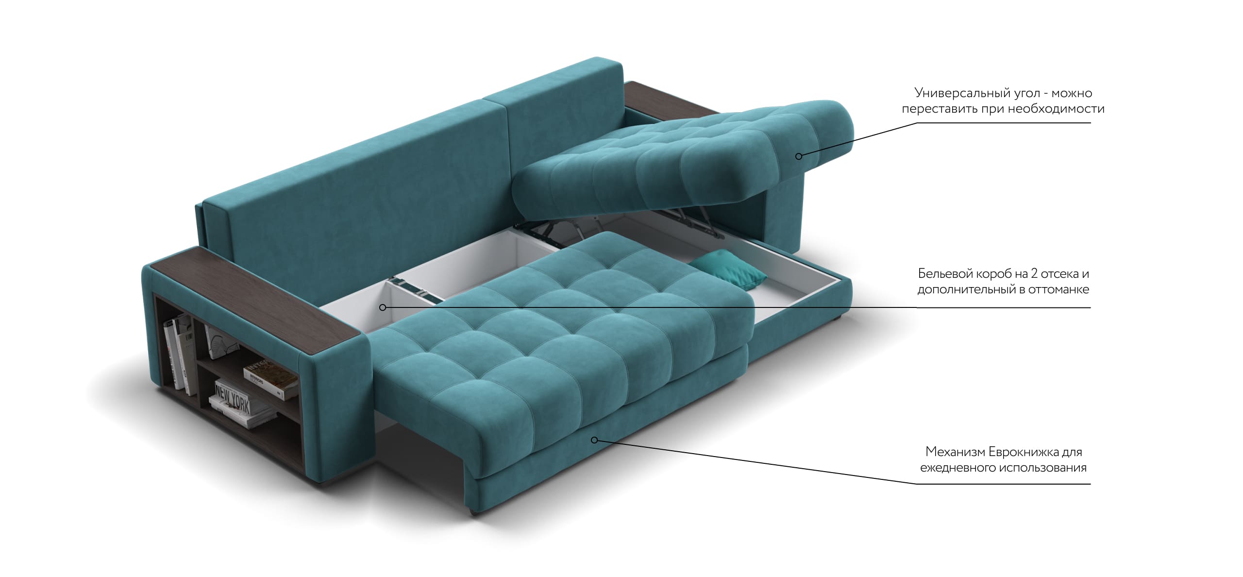 Угловой диван BOSS XL - диван с подъемной оттоманкой и механизмом Еврокнижка.