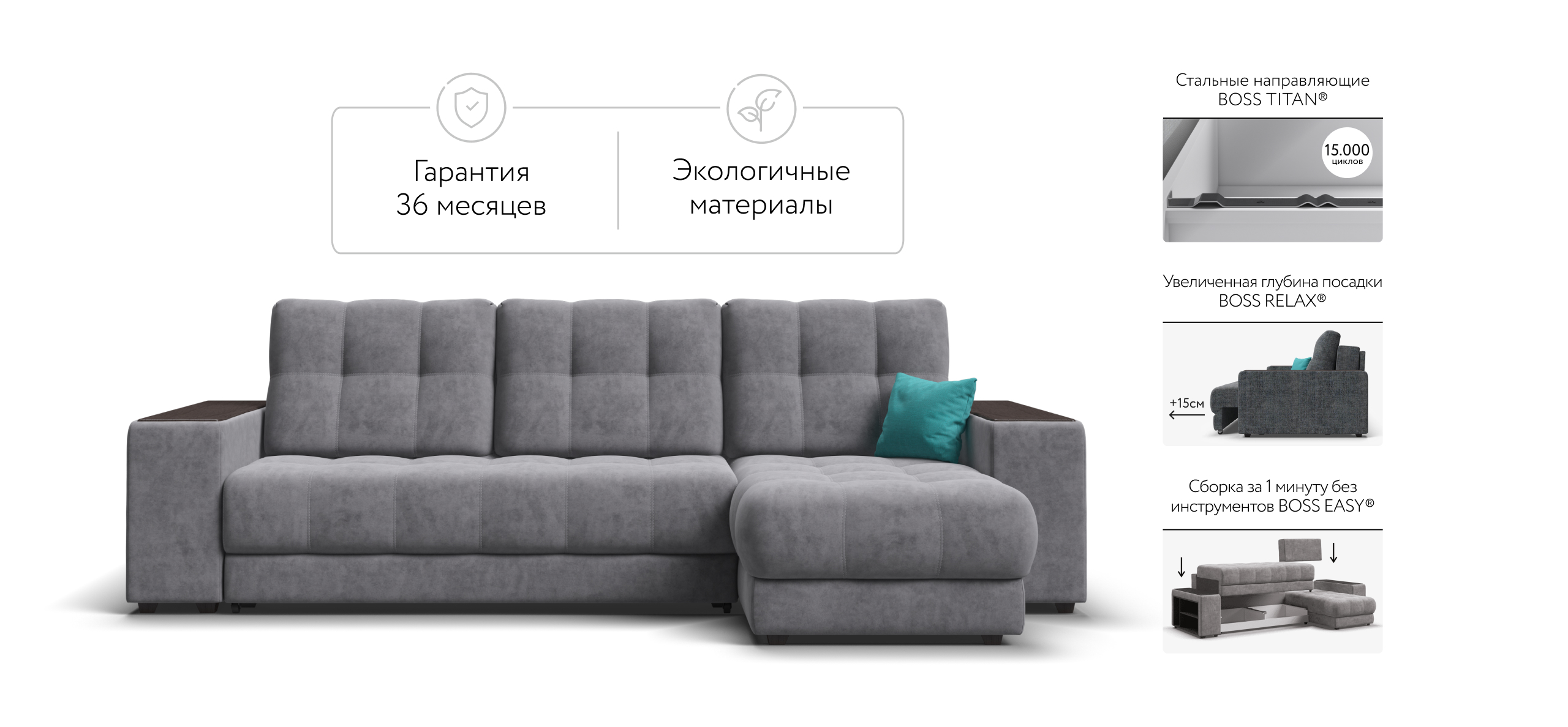 BOSS EASY – сборка дивана за 1 минуту без инструментов. Универсальный угол - положение угла клиент определяет при сборке.
