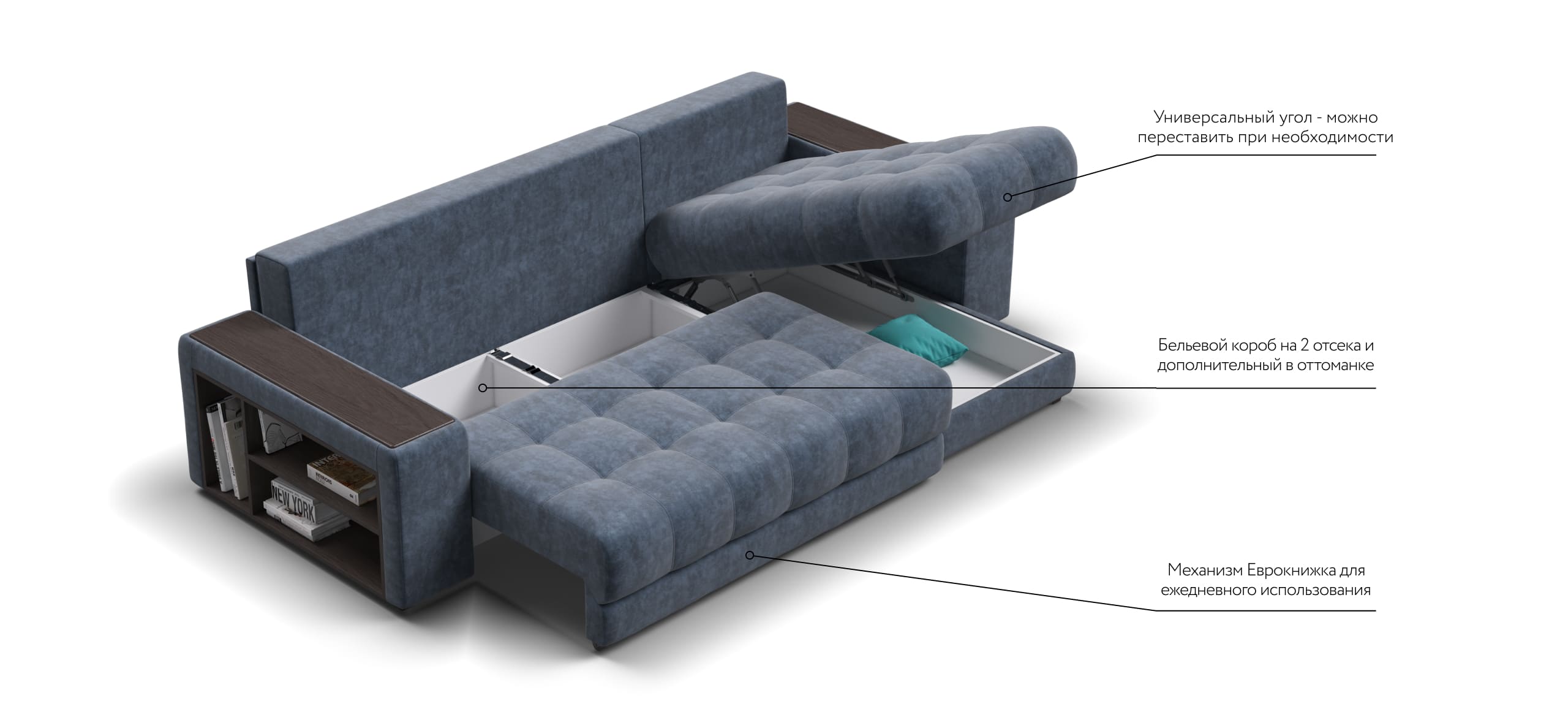 Угловой диван BOSS XL - диван с подъемной оттоманкой и механизмом Еврокнижка.