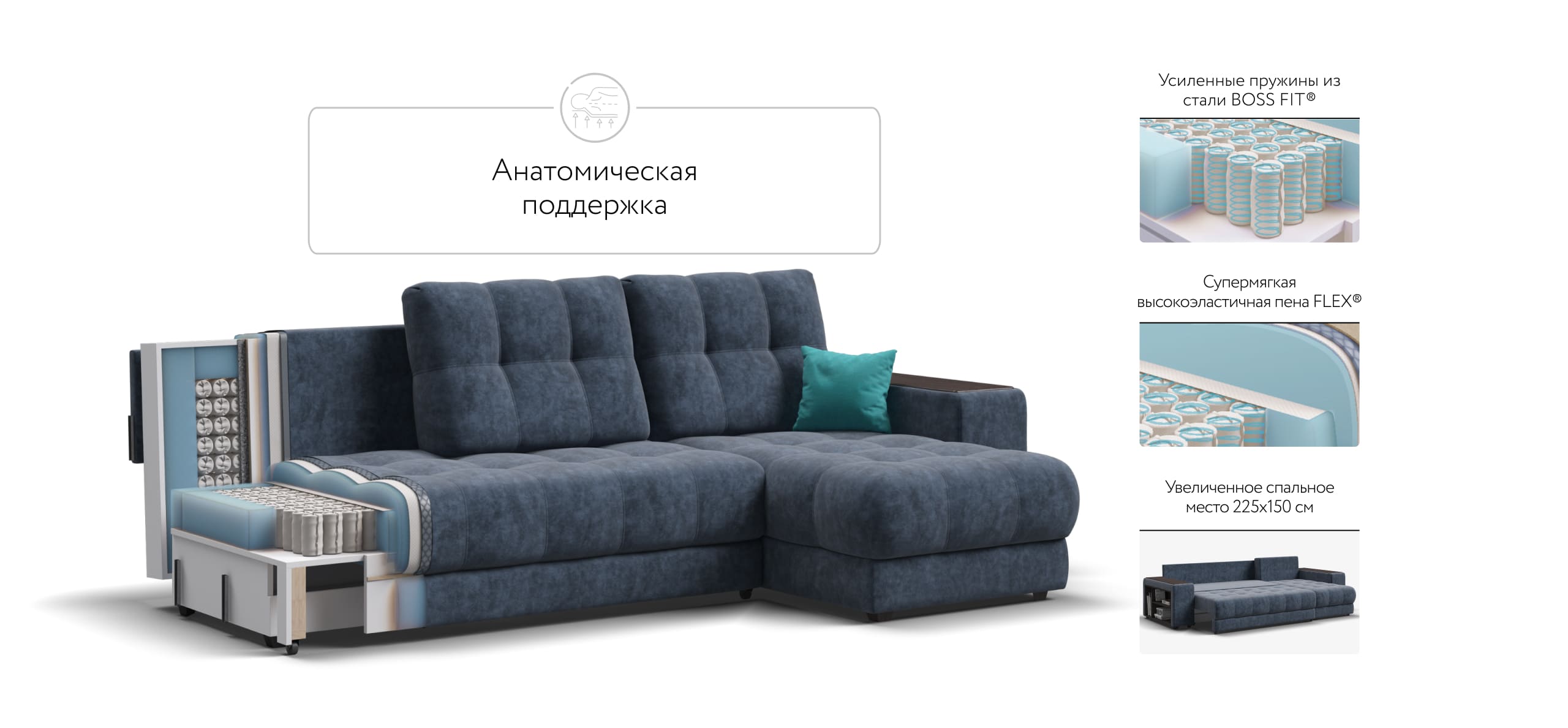 Продуманный до мелочей диван BOSS сочетает в себе функциональный подлокотник, мягкие ткани, надежный каркас, качественное наполнение матраса и быструю сборку за 1 минуту без инструментов - ощутите комфорт у себя дома!