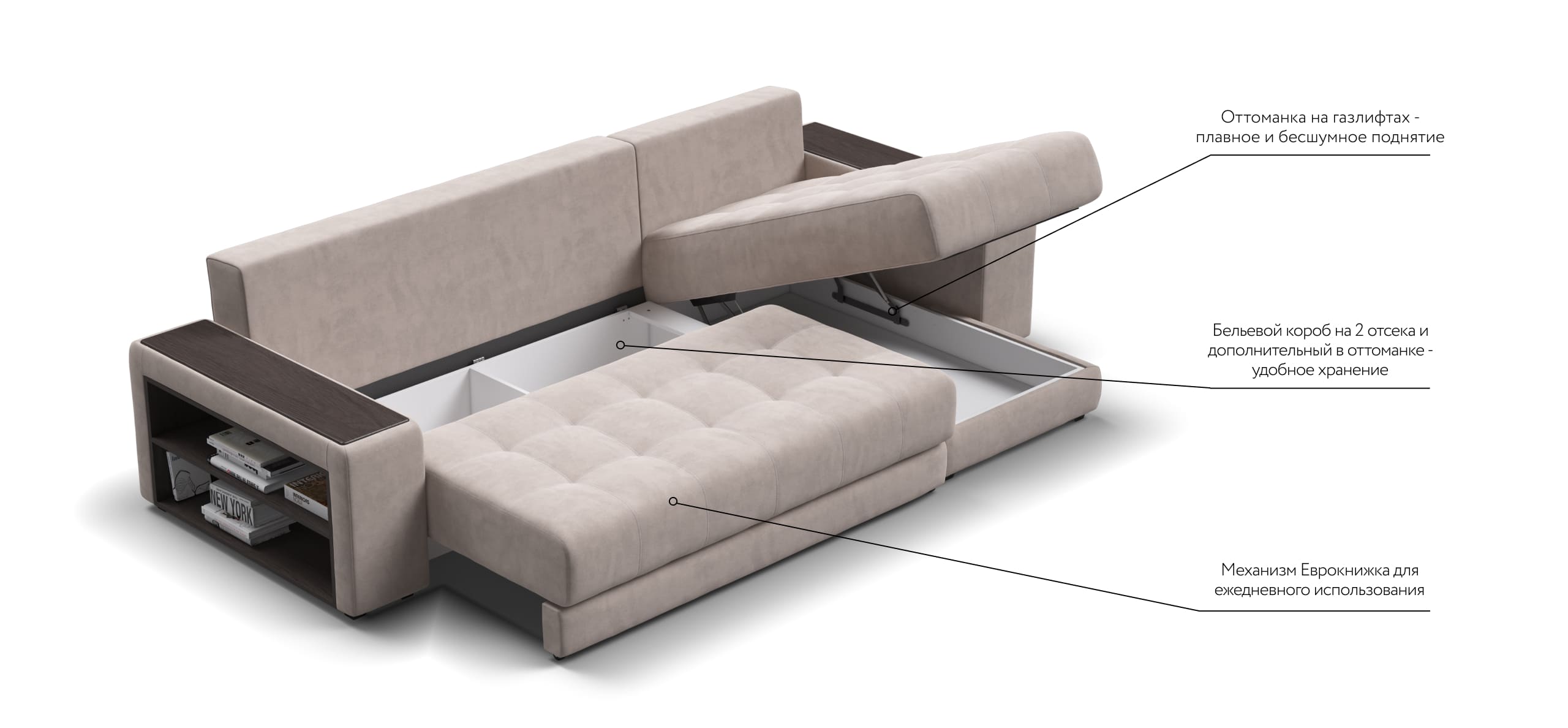 Надежный механизм трансформации еврокнижка сделает Дубай достойной альтернативой традиционной кровати. В основании дивана размещены большие и удобные бельевые ящики.