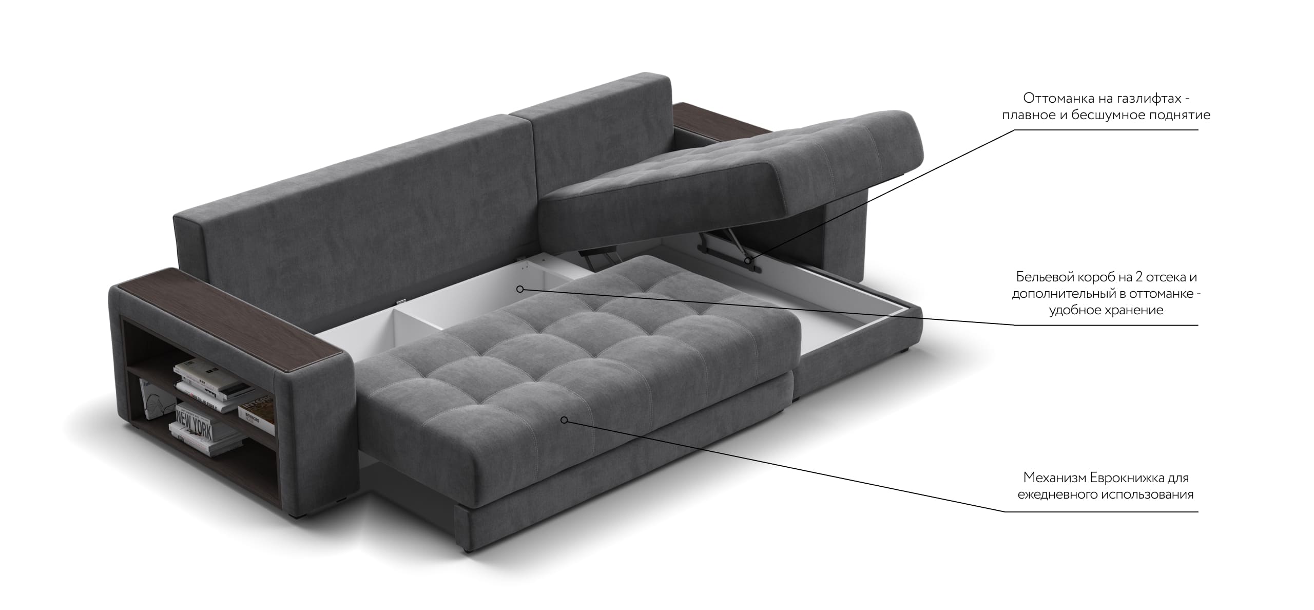 Надежный механизм трансформации еврокнижка сделает Дубай достойной альтернативой традиционной кровати. В основании дивана размещены большие и удобные бельевые ящики.