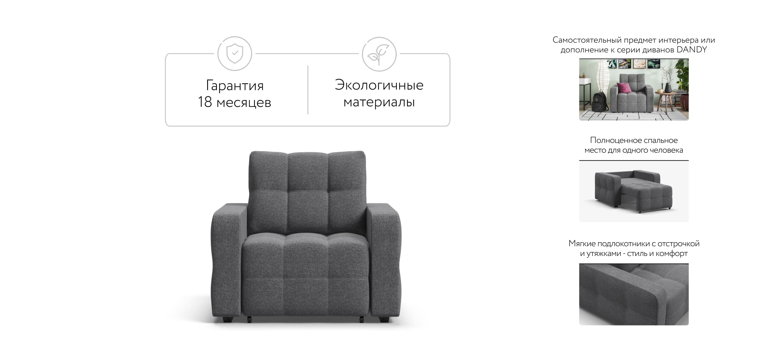 Dandy кресло-кровать с механизмом EASY-ROLL, которое отлично дополняет линейку диванов Dandy. Легким движением руки кресло раскладывается в удобную кровать.