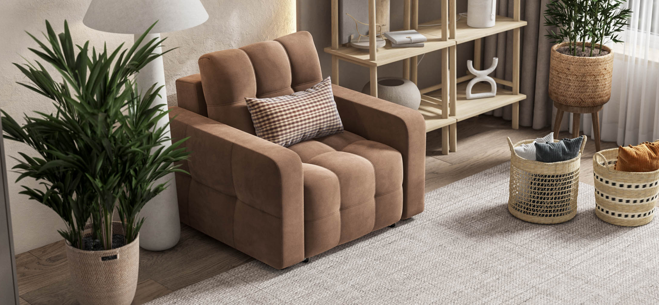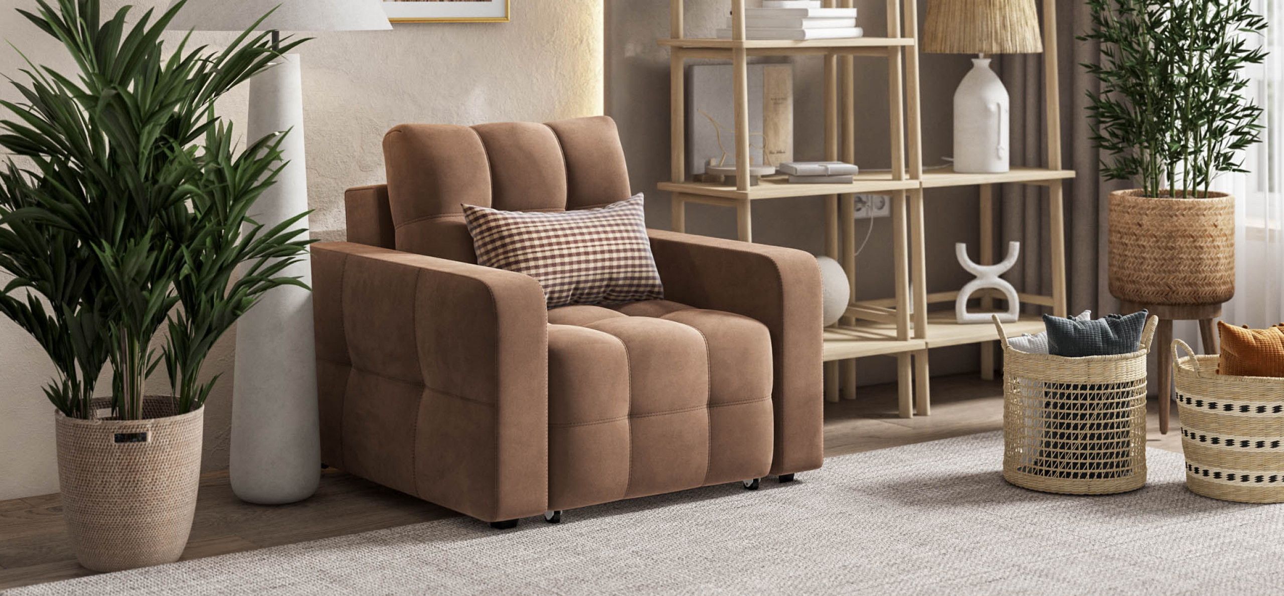 Благодаря современному механизму трансформации EASY-ROLL, кресло легко превращается в удобное спальное место, что делает его отличным вариантом для гостей или для уютных вечеров с книгой. С этим креслом-кроватью вы сможете создать атмосферу уюта и стиля в вашем доме, не жертвуя при этом свободным пространством.