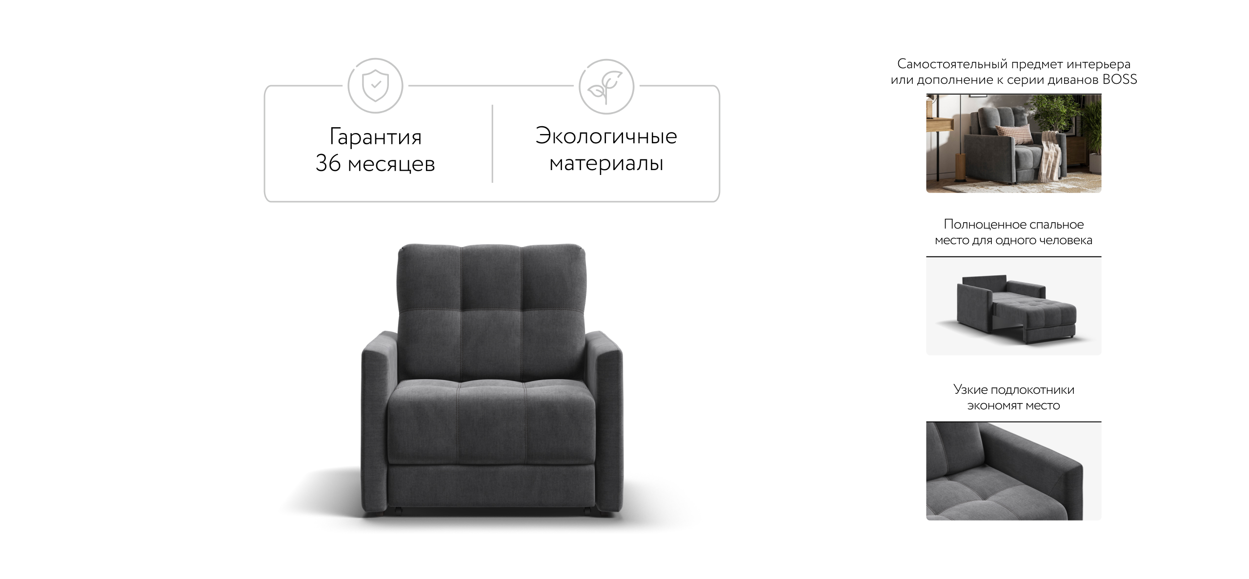 BOSS LOFT кресло-кровать - идеальное дополнение к дивану BOSS LOFT, отлично сочетает в себе две функции: подарит комфортный отдых днем и даст полноценное спальное место для гостя, который решил остаться у вас на ночь. Тонкие подлокотники идеальны для тех, кто ищет не классическое решение для своего интерьера.