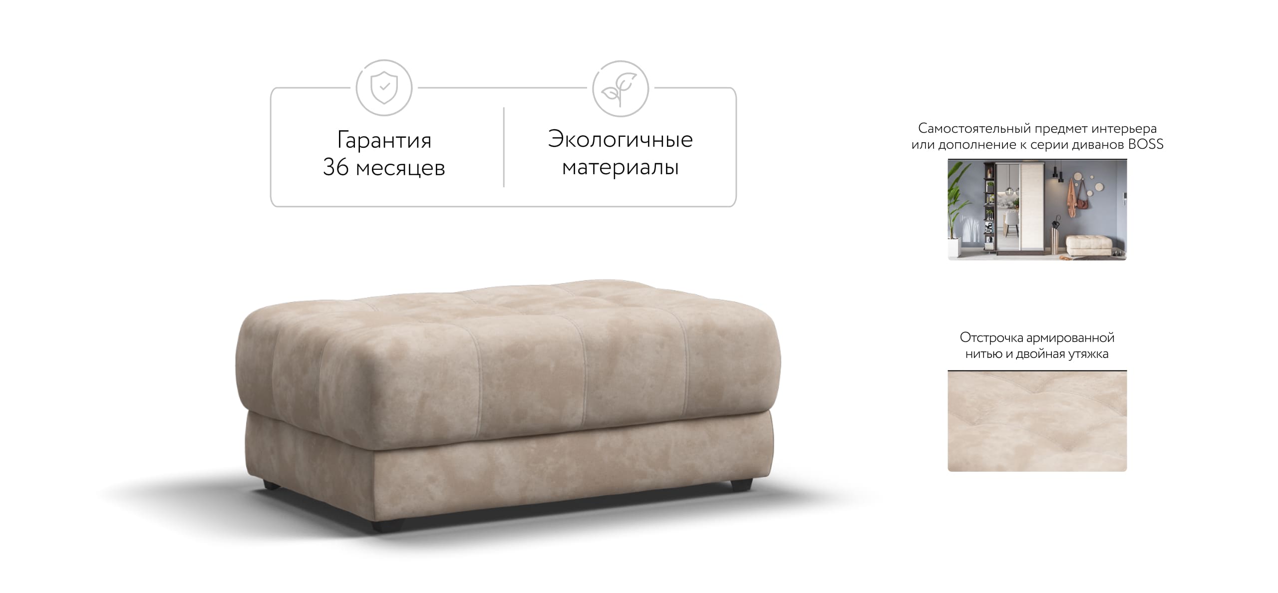 Пуф BOSS - cамостоятельный предмет интерьера или дополнительное посадочное место к любому дивану BOSS. В основании пуфа усиленные пружины BOSS FIT из прочной антикоррозионной стали, а так же пена BOSS FLEX (мягче обычной в 2 раза) = супер комфортный отдых!