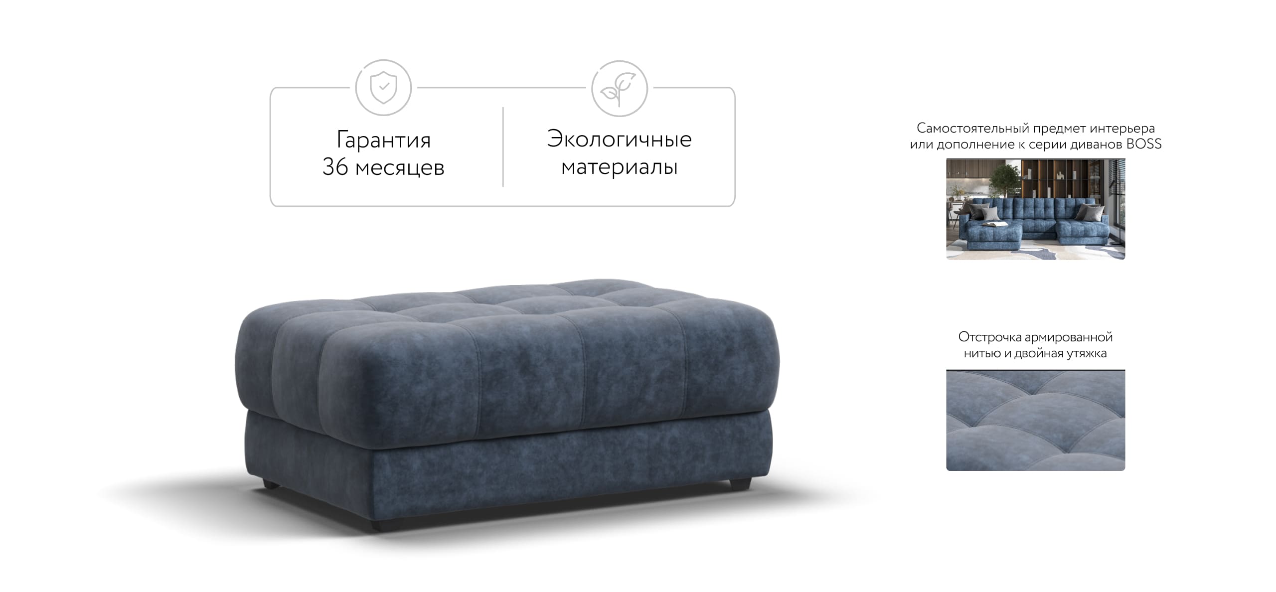 Пуф BOSS - cамостоятельный предмет интерьера или дополнительное посадочное место к любому дивану BOSS. В основании пуфа усиленные пружины BOSS FIT из прочной антикоррозионной стали, а так же пена BOSS FLEX (мягче обычной в 2 раза) = супер комфортный отдых!