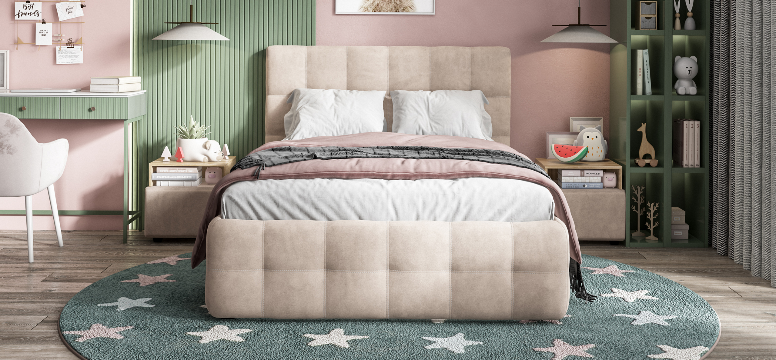 Особое внимание заслуживают газовые лифты SpaceLift, изготовленные из авиационного алюминия. Они обеспечивают лёгкое и плавное поднятие матраса, что делает доступ к отсеку для хранения быстрым и удобным. Дизайн 360 предполагает, что задняя часть спинки кровати также выполнена из основной ткани, что позволяет размещать кровать не только у стены, но и в центре комнаты, сохраняя при этом её эстетическую привлекательность.