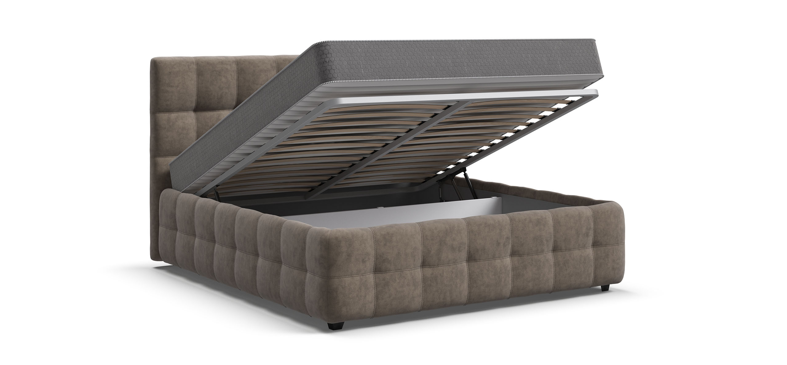 Особое внимание заслуживают газовые лифты SpaceLift, изготовленные из авиационного алюминия. Они обеспечивают лёгкое и плавное поднятие матраса, что делает доступ к отсеку для хранения быстрым и удобным. Дизайн 360 предполагает, что задняя часть спинки кровати также выполнена из основной ткани, что позволяет размещать кровать не только у стены, но и в центре комнаты, сохраняя при этом её эстетическую привлекательность.