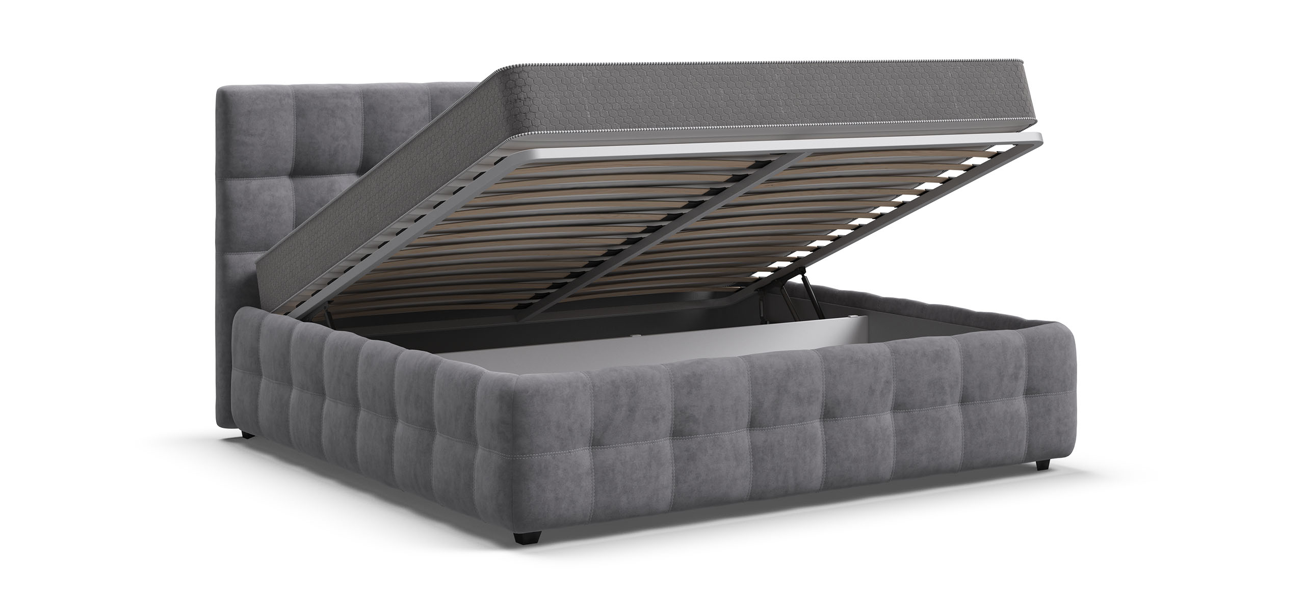 Особое внимание заслуживают газовые лифты SpaceLift, изготовленные из авиационного алюминия. Они обеспечивают лёгкое и плавное поднятие матраса, что делает доступ к отсеку для хранения быстрым и удобным. Дизайн 360 предполагает, что задняя часть спинки кровати также выполнена из основной ткани, что позволяет размещать кровать не только у стены, но и в центре комнаты, сохраняя при этом её эстетическую привлекательность.