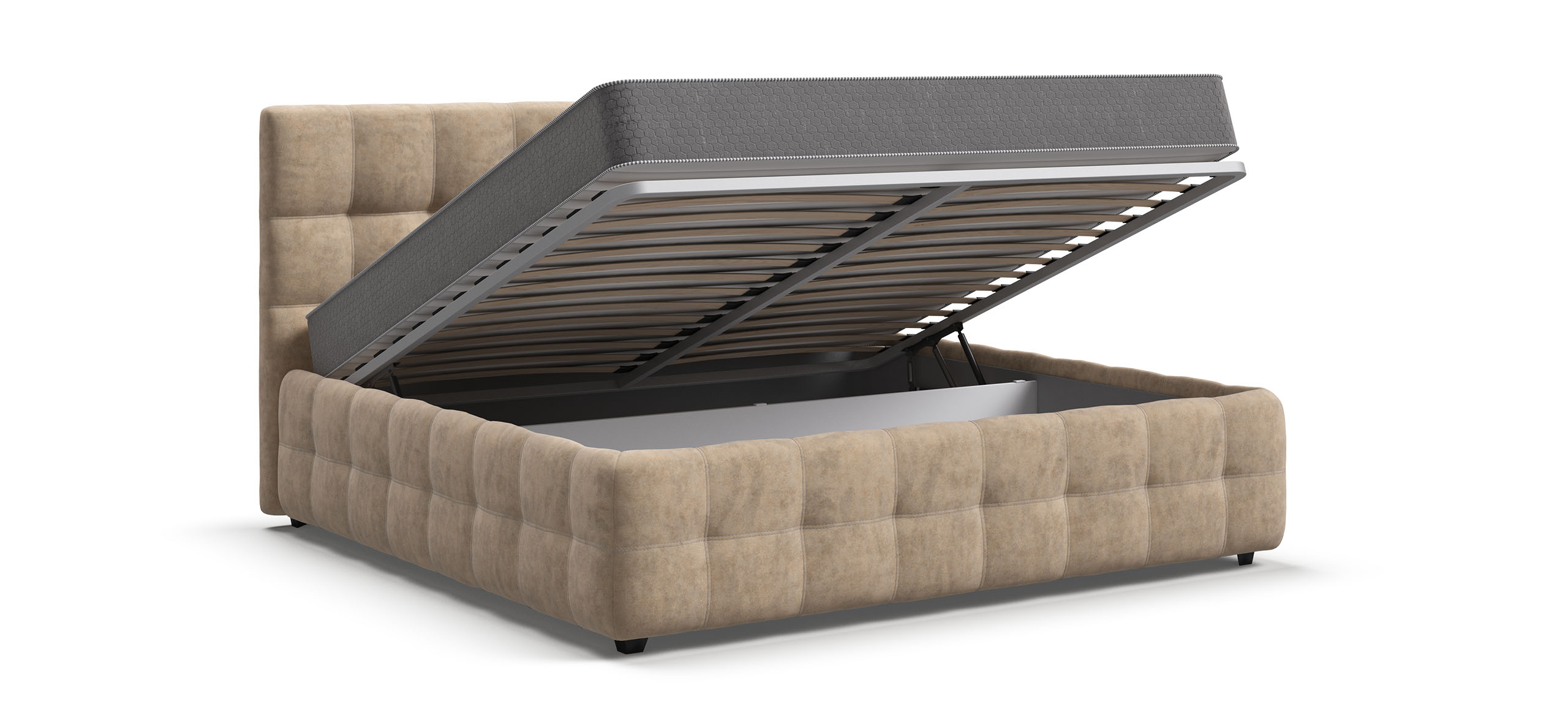 Особое внимание заслуживают газовые лифты SpaceLift, изготовленные из авиационного алюминия. Они обеспечивают лёгкое и плавное поднятие матраса, что делает доступ к отсеку для хранения быстрым и удобным. Дизайн 360 предполагает, что задняя часть спинки кровати также выполнена из основной ткани, что позволяет размещать кровать не только у стены, но и в центре комнаты, сохраняя при этом её эстетическую привлекательность.