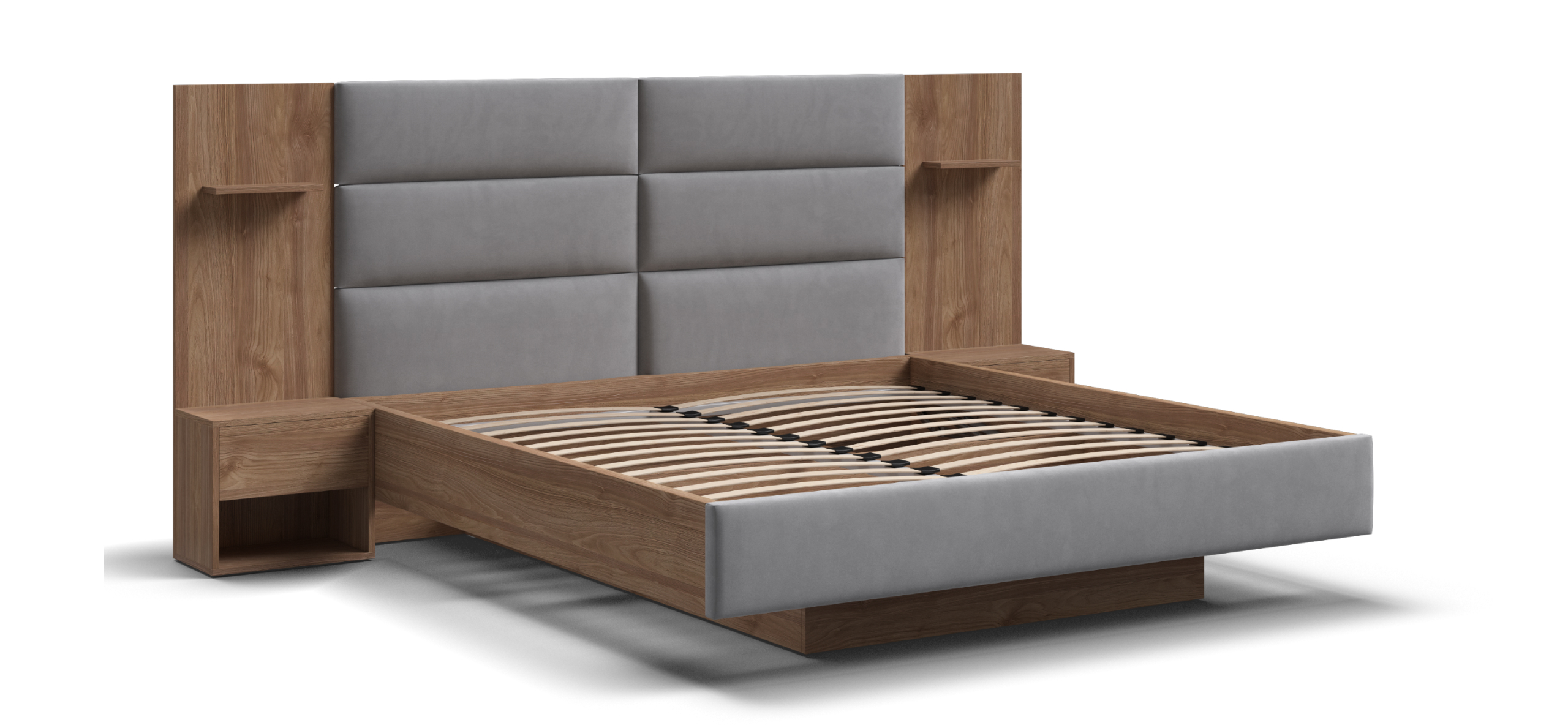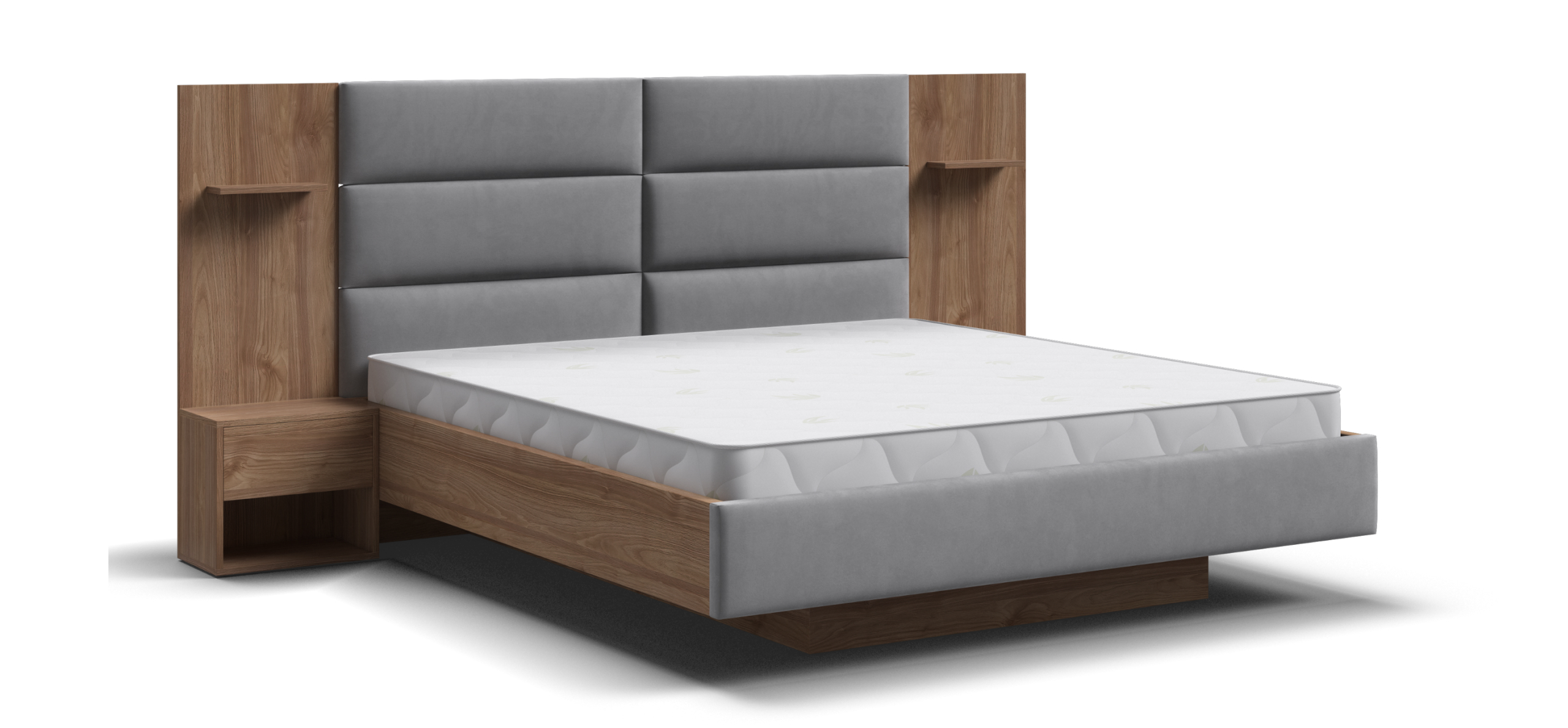 Одной из ключевых особенностей кровати является уникальное сочетание мягкой и корпусной мебели. Мягкое изголовье и передняя царга обеспечивают высокий уровень комфорта и безопасности, тогда как корпусная часть кровати отличается практичностью в использовании и легкостью ухода. Это сочетание древесной плиты и ткани является современным трендом, который продвигает идею экологичности и натуральности в дизайне интерьеров.